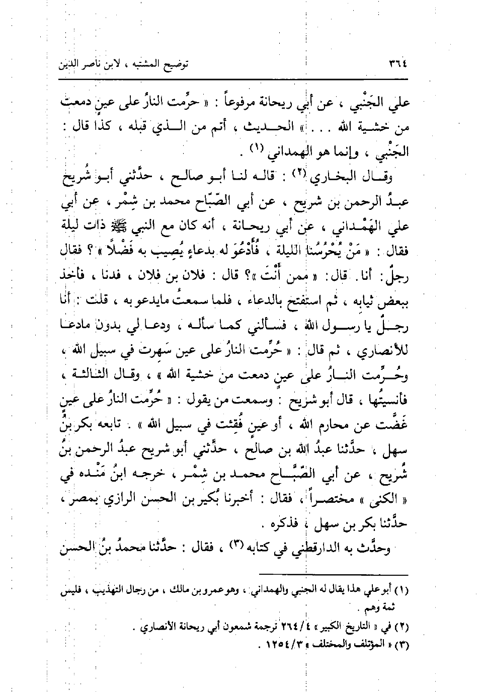 عَليّ الْجَنبي عَن أبي رَيْحَانَة مَرْفُوعا: حرمت النَّار على عين دَمَعَتْ من خشيَة الله الحَدِيث أتم من الَّذِي قبله كَذَا قَالَ: الْجَنبي وَإِنَّمَا هُوَ الْهَمدَانِي وَقَالَ البُخَارِيّ: قَالَه لنا أَبُو صَالح حَدثنِي أَبُو شُرَيْح عبد الرَّحْمَن بن شُرَيْح عَن أبي الصَّباح مُحَمَّد بن شمر عَن أبي عَليّ الْهَمدَانِي عَن أبي رَيْحَانَة انه كَانَ مَعَ النَّبِي صلى الله عَلَيْهِ وَسلم ذَات لَيْلَة فَقَالَ: من يحرسنا اللَّيْلَة فأدعو لَهُ بِدُعَاء يُصِيب بِهِ فضلا؟ فَقَالَ رجل: أَنا قَالَ: مِمَّن أَنْت؟ قَالَ: فلَان بن فلَان فَدَنَا فَأخذ بِبَعْض ثِيَابه ثمَّ استفتح بِالدُّعَاءِ فَلَمَّا سَمِعت مَا يَدْعُو بِهِ قلت: أَنا رجل يَا رَسُول الله فسالني كَمَا ساله ودعا لي بِدُونِ مَا دَعَا للانصاري ثمَّ قَالَ: حرمت النَّار على عين سهرت فِي سَبِيل الله وَحرمت النَّار على عين دَمَعَتْ من خشيَة الله وَقَالَ الثَّالِثَة فأنسيتها قَالَ أَبُو شُرَيْح: وَسمعت من يَقُول: حرمت النَّار على عين غضت عَن محارم الله أَو عي فقئت فِي سَبِيل الله تَابعه بكر بن سهل حَدثنَا عبد الله بن صَالح حَدثنِي أَبُو شُرَيْح عبد الرَّحْمَن بن شُرَيْح عَن أبي الصَّباح مُحَمَّد بن شمر خرجه ابْن مَنْدَه فِي الكنى مُخْتَصرا فَقَالَ: أخبرنَا بكير بن الْحسن الرَّازِيّ بِمصْر حَدثنَا بكر بن سهل فَذكره وَحدث بن الدَّارَقُطْنِيّ فِي كِتَابه فَقَالَ: حَدثنَا مُحَمَّد بن الْحُسَيْن