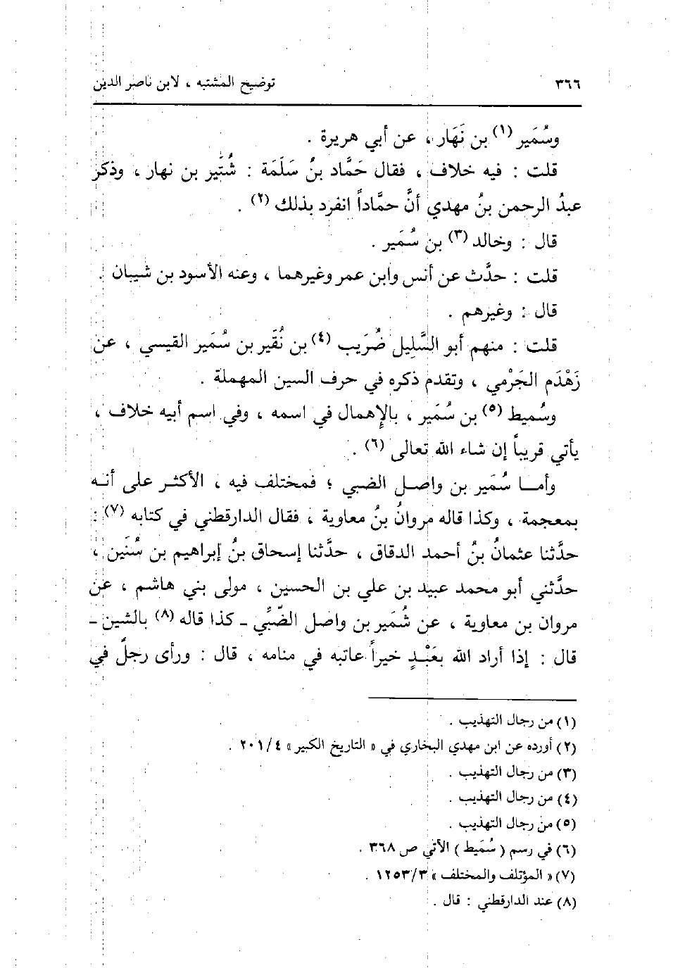 وسمير بن نَهَار عَن أبي هُرَيْرَة قلت: فِيهِ خلاف فَقَالَ حَمَّاد بن سَلمَة: شُتَيْر بن نَهَار وَذكر عبد الرَّحْمَن بن مهْدي أَن حمادا انْفَرد بذلك قَالَ: وخَالِد بن سمير قلت: حدث عَن أنس وَابْن عمر وَغَيرهمَا وَعنهُ الْأسود بن شَيبَان قَالَ: وَغَيرهم قلت: مِنْهُم أَبُو السَّلِيل ضريب بن نقير بن سمير الْقَيْسِي عَن زَهْدَم الْجرْمِي وَتقدم ذكره فِي حرف السِّين الْمُهْملَة وسميط بن سمير بالإهمال فِي اسْمه وَفِي اسْم أَبِيه خلاف يَأْتِي قَرِيبا أَن شَاءَ الله تَعَالَى وَأما سمير بن وَاصل الضَّبِّيّ فمختلف فِيهِ الْأَكْثَر على انه بِمُعْجَمَة وَكَذَا قَالَه مَرْوَان بن مُعَاوِيَة فَقَالَ الدَّارَقُطْنِيّ فِي كِتَابه: حَدثنَا عُثْمَان بن أَحْمد الدقاق حَدثنَا إِسْحَاق بن إِبْرَاهِيم بن سِنِين حَدثنِي أَبُو مُحَمَّد بن عبيد بن عَليّ بن الْحُسَيْن مولى بني هَاشم عَن مَرْوَان بن مُعَاوِيَة عَن شمير بن وَاصل الضَّبِّيّ - كَذَا قَالَه بالشين - قَالَ: إِذا أَرَادَ الله بِعَبْد خيرا عاتبه فِي مَنَامه قَالَ: وَرَأى رجل فِي