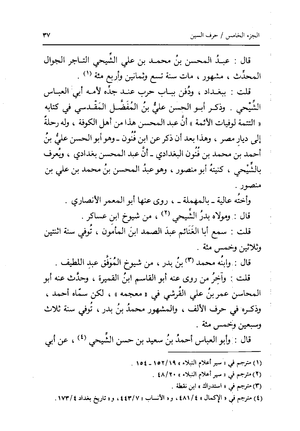 قَالَ: عبد المحسن بن مُحَمَّد بن عَليّ الشيحي التَّاجِر الجوال الْمُحدث مَشْهُور مَاتَ سنة تسع وَثَمَانِينَ واربع مئة. قلت: بِبَغْدَاد وَدفن بِبَاب حَرْب عِنْد جده لأمه أبي الْعَبَّاس الشيحي. وَذكر أَبُو الْحسن عَليّ بن الْمفضل الْمَقْدِسِي فِي كِتَابه التَّتِمَّة لوفيات الْأَئِمَّة أَن عبد المحسن هَذَا من أهل الْكُوفَة وَله رحْلَة إِلَى ديار مصر وَهَذَا بعد أَن ذكر عَن ابْن فنون - وَهُوَ أَبُو الْحسن عَليّ بن أَحْمد بن مُحَمَّد بن فنون الْبَغْدَادِيّ - أَن عبد المحسن بغدادي وَيعرف بالشيحي كنيته أَبُو مَنْصُور وَهُوَ عبد المحسن بن مُحَمَّد بن عَليّ بن مَنْصُور. وَأُخْته عالية - بِالْمُهْمَلَةِ - روى عَنْهَا أَبُو المعمر الْأنْصَارِيّ. قَالَ: ومولاه بدر الشيحي من شُيُوخ ابْن عَسَاكِر. قلت: سمع أَبَا الْغَنَائِم عبد الصَّمد ابْن الْمَأْمُون توفّي سنة اثْنَتَيْنِ وَثَلَاثِينَ وَخمْس مئة. قَالَ: وَابْنه مُحَمَّد بن بدر من شُيُوخ الْمُوفق عبد اللَّطِيف. قلت: وَآخر من روى عَنهُ أَبُو الْقَاسِم ابْن القميرة وَحدث عَنهُ أَبُو المحاسن عمر بن عَليّ الْقرشِي فِي مُعْجَمه لَكِن سَمَّاهُ احْمَد وَذكره فِي حرف الالف وَالْمَشْهُور مُحَمَّد بن بدر توفّي سنة ثَلَاث وَسبعين وَخمْس مئة. قَالَ: وَأَبُو الْعَبَّاس أَحْمد بن سعيد بن حسن الشيحي عَن أبي
