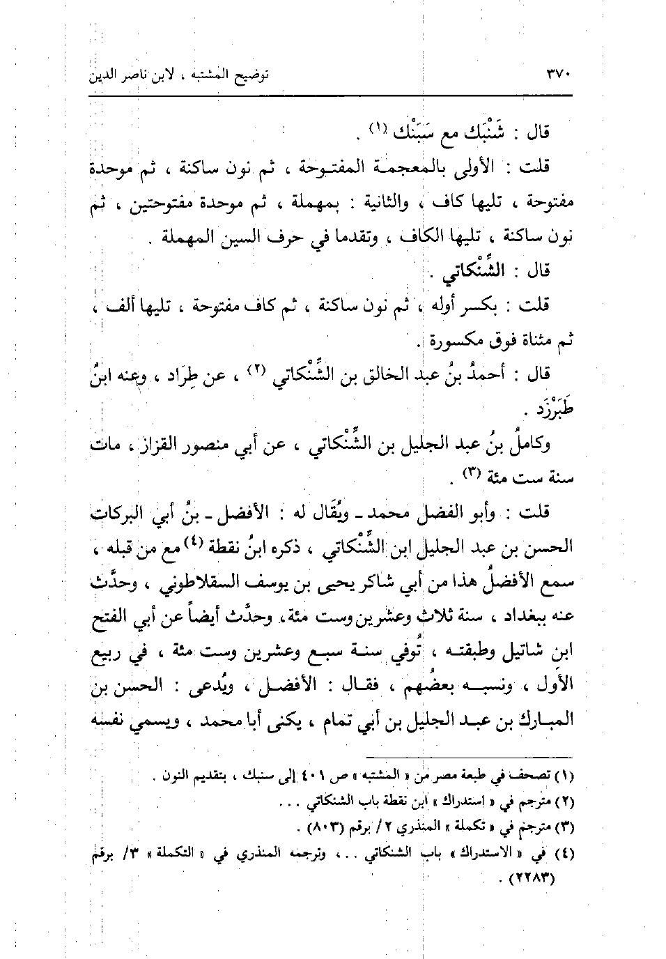 قَالَ: شنبك مَعَ سنبك قلت: الأولى بِالْمُعْجَمَةِ الْمَفْتُوحَة ثمَّ نون سَاكِنة ثمَّ مُوَحدَة مَفْتُوحَة تَلِيهَا كَاف وَالثَّانيَِة: بِمُهْملَة ثمَّ مُوَحدَة مفتوحتين ثمَّ نون سَاكِنة تَلِيهَا الْكَاف وتقدما فِي حرف السِّين الْمُهْملَة قَالَ: الشنكاتي قلت: بِكَسْر اوله ثمَّ نون سَاكِنة ثمَّ كَاف مَفْتُوحَة تَلِيهَا الف ثمَّ مثناة فَوق مَكْسُورَة قَالَ: أَحْمد بن عبد الْخَالِق بن الشنكاتي عَن طراد وَعنهُ ابْن طبرزد وكامل بن عبد الْجَلِيل بن الشنكاتي عَن أبي مَنْصُور الْقَزاز مَاتَ سنة سِتّ مئة قلت: وَأَبُو الْفضل مُحَمَّد - وَيُقَال لَهُ: الْأَفْضَل - بن أبي البركات الْحسن بن عبد الْجَلِيل ابْن الشنكاتي ذكره ابْن نقطة مَعَ من قبله سمع الْأَفْضَل هَذَا من أبي شَاكر يحيى بن يُوسُف السقلاطوني وَحدث عَنهُ بِبَغْدَاد سنة ثَلَاث وَعشْرين وست مئة وَحدث أَيْضا عَن أبي الْفَتْح ابْن شاتيل وطبقته توفّي سنة سبع وَعشْرين وست مئة فِي ربيع الاول وَنسبه بَعضهم فَقَالَ: الْأَفْضَل ويدعى: الْحسن بن الْمُبَارك بن عبد الْجَلِيل بن أبي تَمام يكنى أَبَا مُحَمَّد وَيُسمى نَفسه