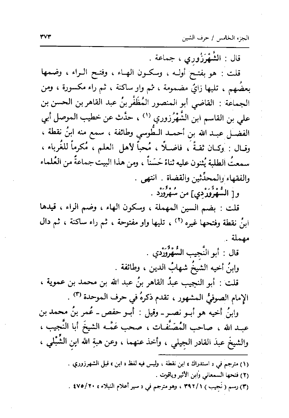 قَالَ: الشهرزوري جمَاعَة قلت: هُوَ بِفَتْح اوله وَسُكُون الْهَاء وَفتح الرَّاء وَضمّهَا بَعضهم تَلِيهَا زَاي مَضْمُومَة ثمَّ وَاو سَاكِنة ثمَّ رَاء مَكْسُورَة وَمن الْجَمَاعَة: القَاضِي أَبُو الْمَنْصُور المظفر بن عبد الْقَهْر بن الْحسن بن عَليّ بن الْقَاسِم ابْن الشهرزوري حدث عَن خطيب الْموصل أبي الْفضل عبد الله بن أَحْمد الطوسي وَطَائِفَة سمع مِنْهُ ابْن نقطة سَمِعت الطّلبَة يثنون عَلَيْهِ ثَنَاء حسنا وَمن هَذَا الْبَيْت جمَاعَة من الْعلمَاء وَالْفُقَهَاء والمحدثين والقضاة انْتهى [السهروردي] من سهرورد قلت: بِضَم السِّين الْمُهْملَة وَسُكُون الْهَاء وَضم الرَّاء قيدها ابْن نقطة وَفتحهَا غَيره تَلِيهَا وَاو مَفْتُوحَة ثمَّ رَاء سَاكِنة ثمَّ دَال مُهْملَة قَالَ: أَبُو النجيب السهروردي وَابْن أَخِيه الشَّيْخ شهَاب الدّين وَطَائِفَة قلت: أَبُو النجيب عبد القاهر بن عبد الله بن مُحَمَّد بن عموية الإِمَام الصُّوفِي الْمَشْهُور تقدم ذكره فِي حرف الْمُوَحدَة وابناخيه هُوَ أَبُو نصر - وَقيل: أَبُو حَفْص - عمر بن مُحَمَّد بن عبد الله صَاحب المصنفات صحب عَمه الشَّيْخ أَبَا النجيب وَالشَّيْخ عبد الْقَادِر الجيلي واخذ عَنْهُمَا وَعَن هبة الله ابْن الشبلي