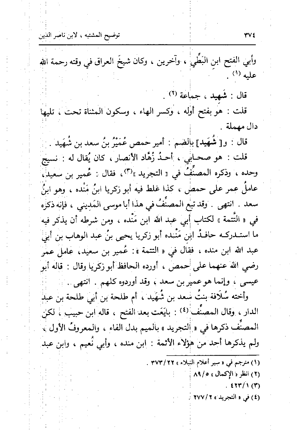 وابي الْفَتْح ابْن البطي وَآخَرين وَكَانَ شيخ الْعرَاق فِي وقته رَحْمَة الله عَلَيْهِ قَالَ: شَهِيد جمَاعَة قلت: هُوَ بِفَتْح أَوله وَكسر الْهَاء وَسُكُون الْمُثَنَّاة تَحت تَلِيهَا دَال مُهْملَة قَالَ: و [شَهِيد] بِالضَّمِّ: أَمِير حمص عُمَيْر بن سعد بن شَهِيد قلت: هُوَ صَحَابِيّ أحد زهاد الانصار كَانَ يُقَال لَهُ: نَسِيج وَحده وَذكره المُصَنّف فِي التَّجْرِيد فَقَالَ: عُمَيْر بن سعيد عَامل عمر على حمص كَذَا غلط فِيهِ أَبُو زَكَرِيَّا ابْن مَنْدَه وَهُوَ ابْن سعد انْتهى وَقد تبع المُصَنّف فِي هَذَا أَبَا مُوسَى الْمَدِينِيّ فَإِنَّهُ ذكره فِي التَّتِمَّة لكتاب ابي عبد الله ابْن مَنْدَه وَمن شَرطه أَن يذكر فِيهِ مَا استدركه حافد ابْن مَنْدَه أَبُو زَكَرِيَّا يحيى بن عبد الْوَهَّاب بن أبي عبد الله ابْن مَنْدَه فَقَالَ فِي التَّتِمَّة: عُمَيْر بن سعيد عَامل عمر رَضِي الله عَنْهُمَا على حمص أوردهُ الْحَافِظ أَبُو زَكَرِيَّا وَقَالَ: قَالَه أَبُو عِيسَى وَإِنَّمَا هُوَ عُمَيْر بن سعد وَقد اوردوه كلهم انْتهى واخته سلافة بنت سعد بن شَهِيد أم طَلْحَة بن أبي طَلْحَة بن عبد الدَّار وَقَالَ المُصَنّف: بَايَعت بعد الْفَتْح قَالَه ابْن حبيب لَكِن المُصَنّف ذكرهَا فِي التَّجْرِيد بِالْمِيم بدل الْفَاء وَالْمَعْرُوف الأول وَلم يذكرهَا أحد من هَؤُلَاءِ الْأَئِمَّة: ابْن مَنْدَه وابي نعيم وَابْن عبد