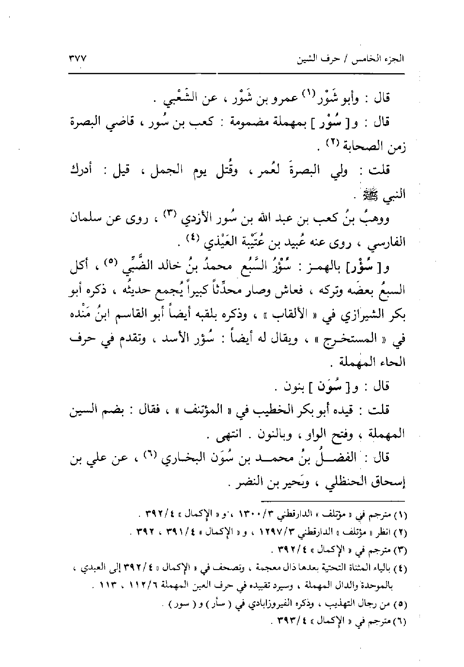 قَالَ: وَأَبُو شور عمر بن شور عَن الشّعبِيّ قَالَ: و [سور] بِمُهْملَة مَضْمُومَة: كَعْب بن سورن قَاضِي الْبَصْرَة زمن الصَّحَابَة قلت: ولي الْبَصْرَة لعمر وَقتل يَوْم الْجمل قيل: أدْرك النَّبِي صلى الله عَلَيْهِ وَسلم ووهب بن كَعْب بن عبد اللهبن سور الازدي روى عَن سلمَان الْفَارِسِي روى عَنهُ عبيد بن عتيبة العيذي و [سُؤْر] بِالْهَمْز: سُؤْر السَّبع مُحَمَّد بن خَالِد الضَّبِّيّ أكل السَّبع بعضه وَتَركه فَعَاشَ وَصَارَ مُحدثا كَبِيرا يجمع حَدِيثه ذكره أَبُو بكر الشِّيرَازِيّ فِي الألقاب وَذكره بلقبه أَيْضا أَبُو الْقَاسِم ابْن مَنْدَه فِي الْمُسْتَخْرج وَيُقَال لَهُ ايضا سُؤْر الاسد وَتقدم فِي حرف الْحَاء الْمُهْملَة قَالَ: و [سون] بنُون قلت: قَيده أَبُو بكر الْخَطِيب فِي المؤتنف فَقَالَ: بِضَم السِّين الْمُهْملَة وَفتح الْوَاو وبالنون انْتهى قَالَ: الْفضل بن مُحَمَّد بن سون البُخَارِيّ عَن عَليّ بن إِسْحَاق الْحَنْظَلِي وبحير بن النَّضر.