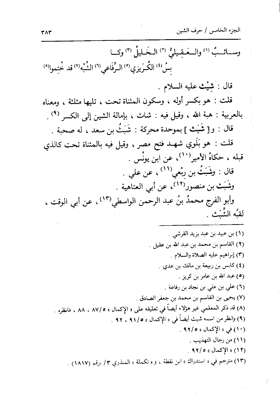 قَالَ: شِيث عَلَيْهِ السَّلَام قلت: هُوَ بِكَسْر اوله وَسُكُون الْمُثَنَّاة تَحت تَلِيهَا مُثَلّثَة وَمَعْنَاهُ بِالْعَرَبِيَّةِ: هبة الله وَقيل فِيهِ: شاث بإمالة الشين إِلَى الْكسر قَالَ: و [شبث] بموحدة محركة: شبث بن سعدن لَهُ صُحْبَة قلت: هُوَ بلوي شهد فتح مصر وَقيل فِيهِ بِالْمُثَنَّاةِ تَحت كَالَّذي قبله حَكَاهُ الامير عَن ابْن يُونُس قَالَ: وشبث بن ربعي عَن عَليّ وشبث بن مَنْصُور عَن أبي الْعَتَاهِيَة وَأَبُو الْفرج مُحَمَّد بن عبد الرَّحْمَن الوَاسِطِيّ عَن أبي الْوَقْت لقبه الشبث.