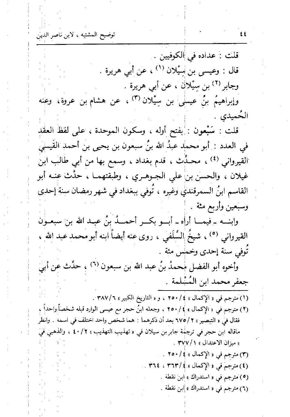 قلت: عداده فِي الْكُوفِيّين. قَالَ: وَعِيسَى بن سيلان عَن أبي هُرَيْرَة. وَجَابِر بن سيلان عَن أبي هُرَيْرَة. وَإِبْرَاهِيم بن عِيسَى بن سيلان عَن هِشَام بن عُرْوَة وَعنهُ الْحميدِي. قلت: سَبْعُونَ: بِفَتْح اوله وَسُكُون الْمُوَحدَة على لفظ العقد فِي الْعدَد: أَبُو مُحَمَّد عبد الله بن سَبْعُونَ بن يحيى بن أَحْمد الْقَيْسِي القيرواني مُحدث قدم بَغْدَاد وَسمع بهَا من أبي طَالب ابْن غيلَان وَالْحسن بن عَليّ الْجَوْهَرِي وطبقتهما حدث عَنهُ أَبُو الْقَاسِم ابْن السَّمرقَنْدِي وَغَيره توفّي بِبَغْدَاد فِي شهر رَمَضَان سنة إِحْدَى وَسبعين واربع مئة. وَابْنه - فِيمَا اراه - أَبُو بكر أَحْمد بن عبد الله بن سَبْعُونَ القيرواني شيخ السلَفِي روى عَنهُ أَيْضا ابْنه أَبُو مُحَمَّد عبد الله توفّي سنة إِحْدَى وَخمْس مئة. واخوه أَبُو الْفضل مُحَمَّد بن عبد الله بن سَبْعُونَ حدث عَن أبي جَعْفَر مُحَمَّد ابْن الْمسلمَة.