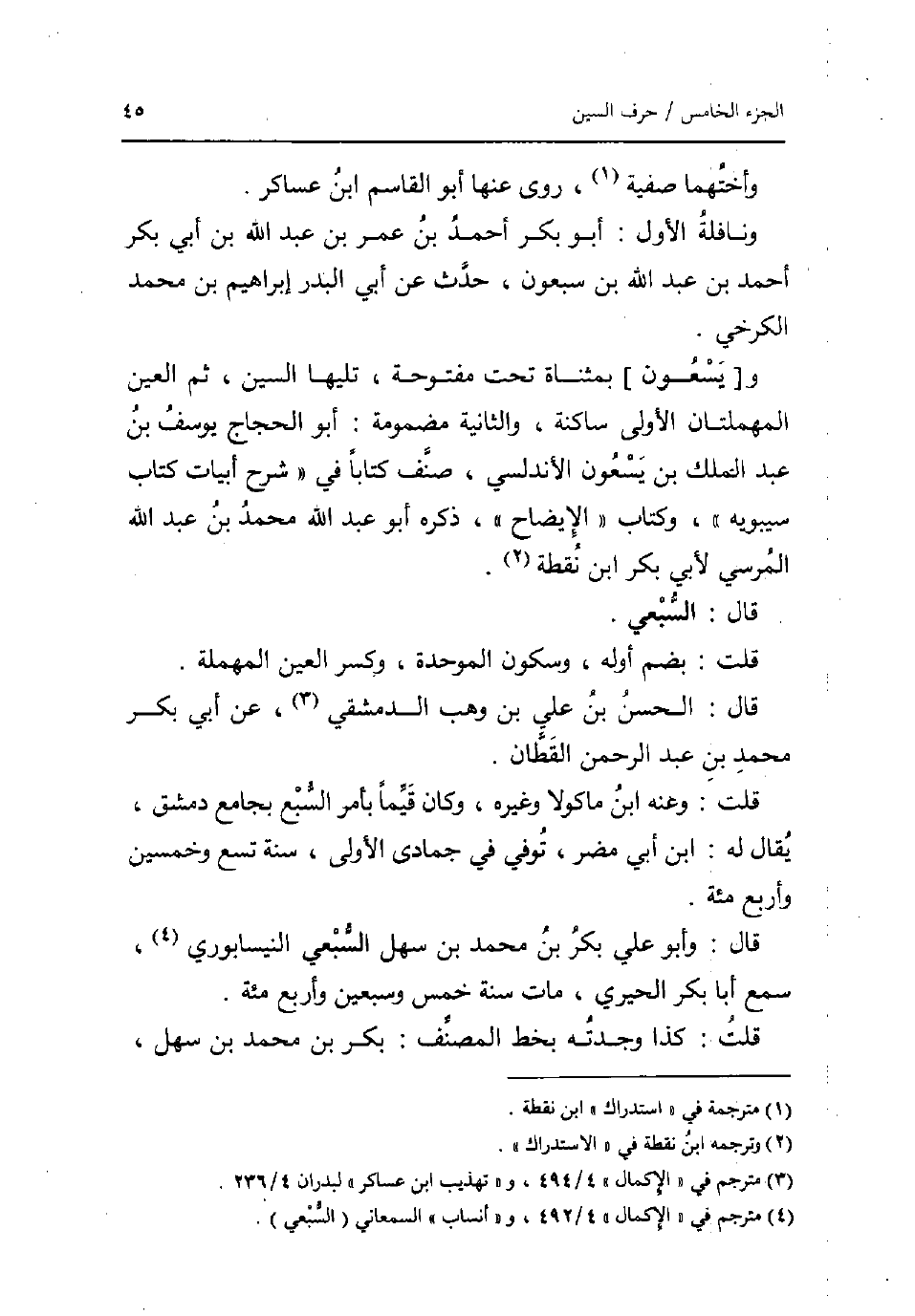 واختهما صَفِيَّة روى عَنْهَا أَبُو الْقَاسِم ابْن عَسَاكِر. ونافلة الأول: أَبُو بكر أَحْمد بن عمر بن عبد الله بن أبي بكر أَحْمد بن عبد الله بن سَبْعُونَ حدث عَن أبي الْبَدْر إِبْرَاهِيم بن مُحَمَّد الْكَرْخِي. و [يسعون] بمثناة تَحت مَفْتُوحَة تَلِيهَا السِّين ثمَّ الْعين المهملتان الأولى سَاكِنة وَالثَّانيَِة مَضْمُومَة: أَبُو الْحجَّاج يُوسُف بن عبد الْملك بن يسعون الاندلسي صنف كتابا فِي شرح ابيات كتاب سِيبَوَيْهٍ وَكتاب الْإِيضَاح ذكره أَبُو عبد الله مُحَمَّد بن عبد الله المرسي لأبي بكر ابْن نقطة. قَالَ: السبعي. قلت: بِضَم اوله وَسُكُون الْمُوَحدَة وَكسر الْعين الْمُهْملَة. قَالَ: الْحسن بن عَليّ بن وهب الدِّمَشْقِي عَن أبي بكر مُحَمَّد بن عبد الرَّحْمَن الْقطَّان. قلت: وَعنهُ ابْن مَاكُولَا وَغَيره وَكَانَ قيمًا بِأَمْر السَّبع بِجَامِع دمشق يُقَال لَهُ: ابْن أبي مُضر توفّي فِي جُمَادَى الاولى سنة تسع وَخمسين وَأَرْبع مئة. قَالَ: وَأَبُو عَليّ بكر بن مُحَمَّد بن سهل السبعي النَّيْسَابُورِي سمع أَبَا بكر الْحِيرِي مَاتَ سنة خمس وَسبعين واربع مئة. قلت: كَذَا وجدته بِخَط المُصَنّف: بكر بن مُحَمَّد بن سهل