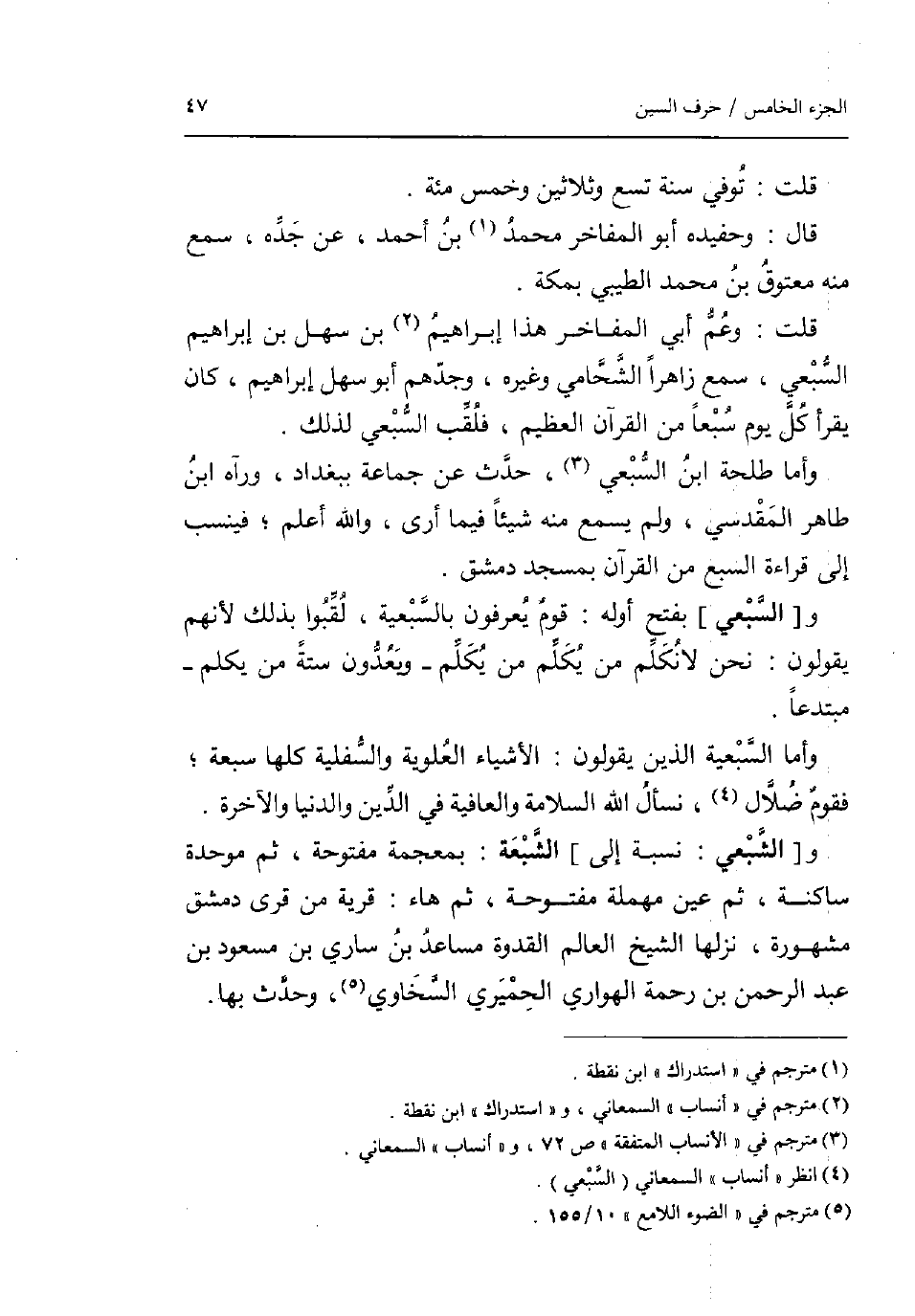 قلت: توفّي سنة تسع وَثَلَاثِينَ وَخمْس مئة. قَالَ: وحفيده أَبُو المفاخر مُحَمَّد بن احْمَد عَن جده سمع مِنْهُ معتوق بن مُحَمَّد الطَّيِّبِيّ بِمَكَّة. قلت: وَعم أبي المفاخر هَذَا إِبْرَاهِيم بن سهل بن إِبْرَاهِيم السبعي سمع زاهرا الشحامي وَغَيره وجدهم أَبُو سهل ابراهيم كَانَ يقْرَأ كل يَوْم سبعا من الْقُرْآن الْعَظِيم فلقب السبعي لذَلِك. وَأما طَلْحَة ابْن السبعي حدث عَن جمَاعَة بِبَغْدَاد وَرَآهُ ابْن طَاهِر الْمَقْدِسِي وَلم يسمع مِنْهُ شَيْئا فِيمَا أرى وَالله اعْلَم فينسب إِلَى قِرَاءَة السَّبع من الْقُرْآن بِمَسْجِد دمشق. و [السبعي] بِفَتْح أَوله: قوم يعْرفُونَ بالسبعية لقبوا بذلك لانهم يَقُولُونَ: نَحن لانكلم من يكلم من يكلم - ويعدون سِتَّة من يكلم - مبتدعا. واما السبعية الَّذين يَقُولُونَ: الْأَشْيَاء العلوية والسفلية كلهَا سَبْعَة فقوم ضلال نسْأَل الله السَّلامَة والعافية فِي الدّين وَالدُّنْيَا وَالْآخِرَة. و [الشبعي: نِسْبَة إِلَى] الشبعة: بِمُعْجَمَة مَفْتُوحَة ثمَّ مُوَحدَة سَاكِنة ثمَّ عين مُهْملَة مَفْتُوحَة ثمَّ هَاء: قَرْيَة من قرى دمشق مَشْهُورَة نزلها الشَّيْخ الْعَالم الْقدْوَة مساعد بن ساري بن مَسْعُود بن عبد الرَّحْمَن بن رَحْمَة الهواري الْحِمْيَرِي السخاوي وَحدث بهَا.