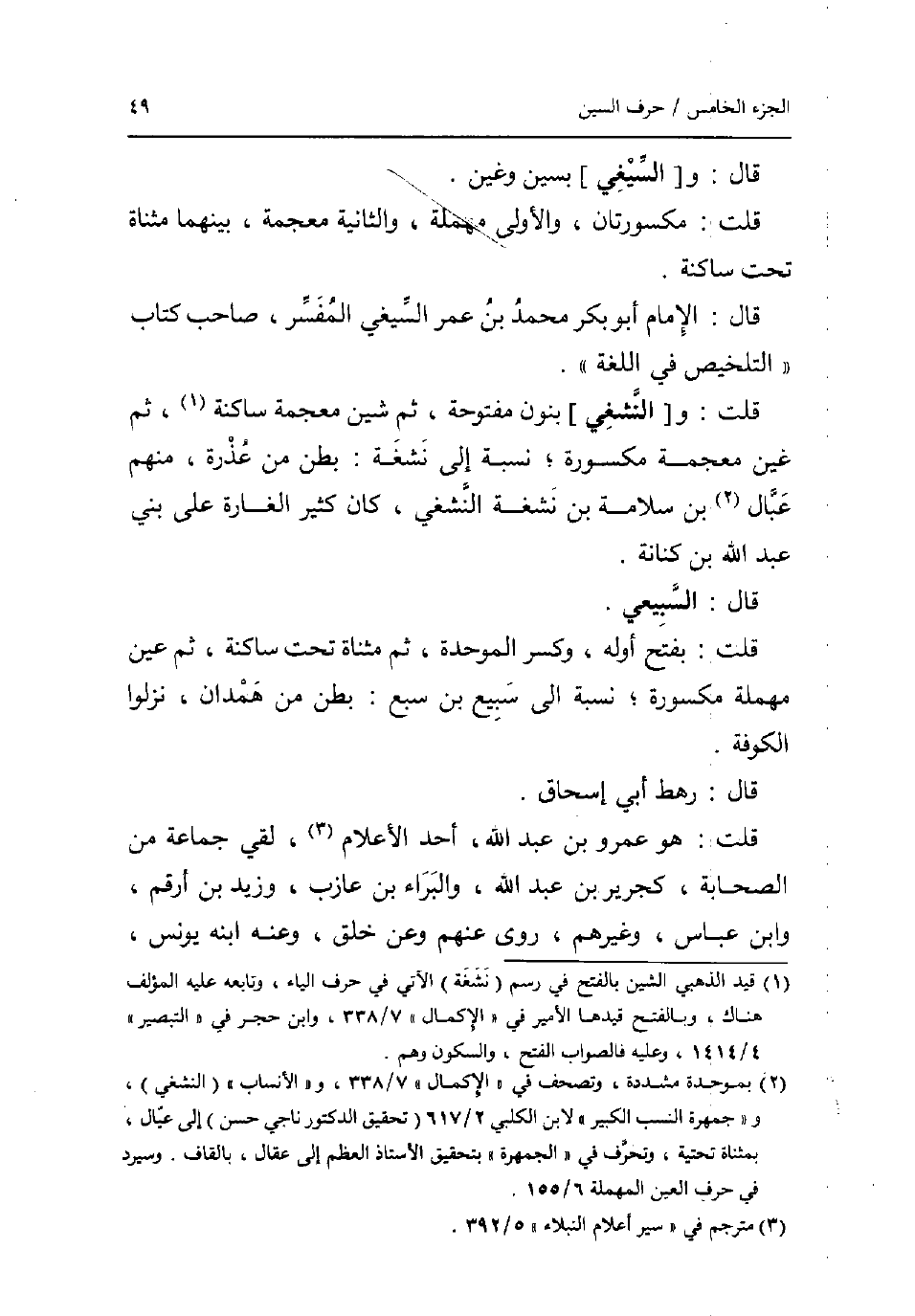 قَالَ: و [السيغي] بسين وغين. قلت: مكسورتان وَالْأولَى مُهْملَة وَالثَّانيَِة مُعْجمَة بَينهمَا مثناة تَحت سَاكِنة. قَالَ: الإِمَام أَبُو بكر مُحَمَّد بن عمر السيغي الْمُفَسّر صَاحب كتاب التَّلْخِيص فِي اللُّغَة. قلت: و [النشغي] بنُون مَفْتُوحَة ثمَّ شين مُعْجمَة سَاكِنة ثمَّ غين مُعْجمَة مَكْسُورَة نِسْبَة إِلَى نشغة: بطن من عذرة مِنْهُم عبال بن سَلامَة بن نشغة النشغي كَانَ كثير الْغَارة على بني عبد الله بن كنَانَة. قَالَ: السبيعِي. قلت: بِفَتْح اوله وَكسر الْمُوَحدَة ثمَّ مثناة تَحت سَاكِنة ثمَّ عين مُهْملَة مَكْسُورَة نِسْبَة إِلَى سبيع بن سبع: بطن من هَمدَان نزلُوا الْكُوفَة. قَالَ: رَهْط أبي إِسْحَاق. قلت: هُوَ عَمْرو بن عبد الله أحد الاعلام لَقِي جمَاعَة من الصَّحَابَة كجرير بن عبد الله والبراء بن عَازِب وَزيد بن أَرقم وَابْن عَبَّاس وَغَيرهم روى عَنْهُم وَعَن خلق وَعنهُ ابْنه يُونُس