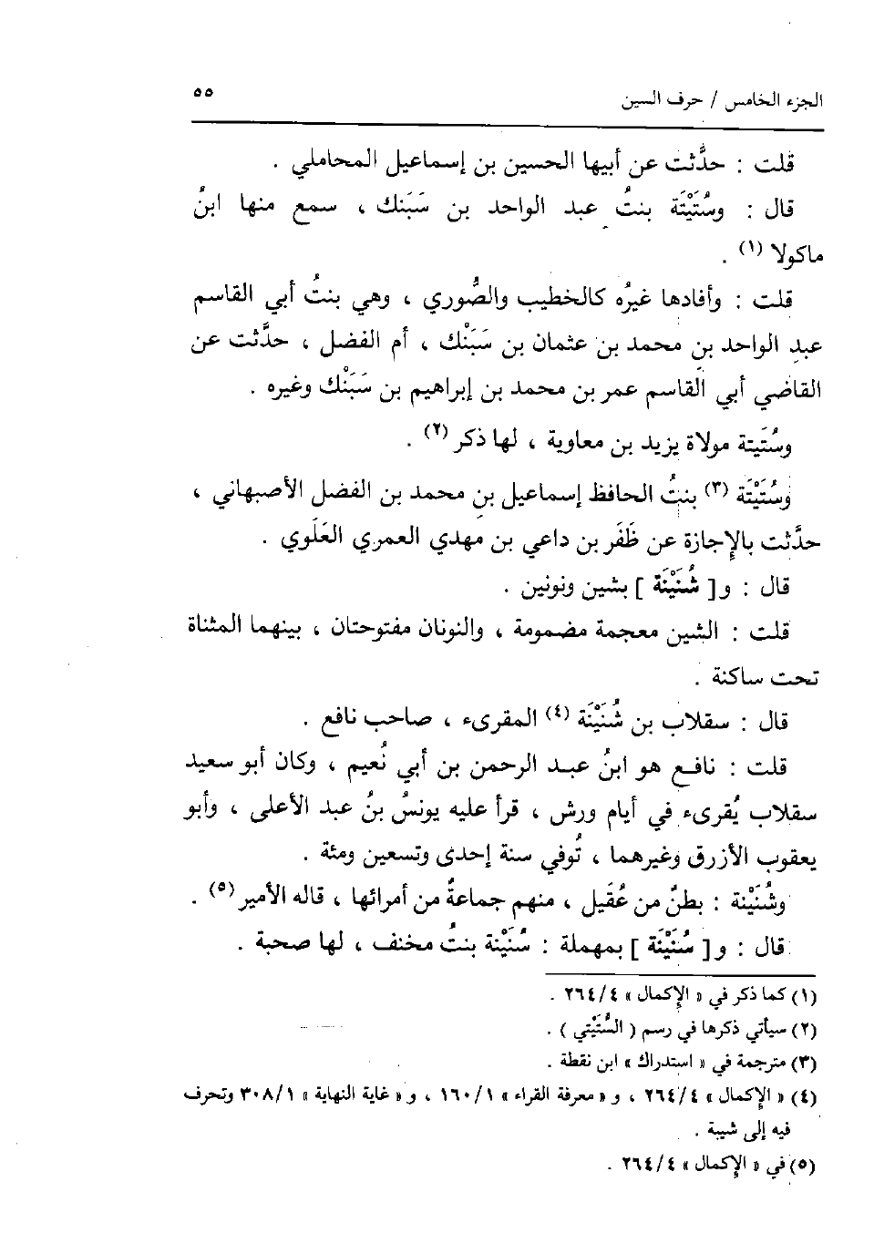 قلت: حدثت عَن ابيها الْحُسَيْن بن إِسْمَاعِيل الْمحَامِلِي. قَالَ: وستيتة بنت عبد الْوَاحِد بن سبنك سمع مِنْهَا ابْن مَاكُولَا. قلت: وأفادها غَيره كالخطيب والصوري وَهِي بنت أبي الْقَاسِم عبد الْوَاحِد بن مُحَمَّد بن عُثْمَان بن سبنك أم الْفضل حدثت عَن القَاضِي أبي الْقَاسِم عمر بن مُحَمَّد بن إِبْرَاهِيم بن سبنك وَغَيره. وستيتة مولاة يزِيد بن مُعَاوِيَة لَهَا ذكر. وستيتة بنت الْحَافِظ إِسْمَاعِيل بن مُحَمَّد بن الْفضل الاصبهاني حدثت بالاجازة عَن ظفر بن دَاعِي بن مهْدي الْعمريّ الْعلوِي. قَالَ: و [شنينة] بشين ونونين. قلت: الشين مُعْجمَة مَضْمُومَة والنونان مفتوحتان بَينهمَا الْمُثَنَّاة تَحت سَاكِنة. قَالَ: سقلاب بن شنينة الْمُقْرِئ صَاحب نَافِع. قلت: نَافِع هُوَ ابْن عبد الرَّحْمَن بن أبي نعيم وَكَانَ أَبُو سعيد سقلاب يقرئ فِي أَيَّام ورش قَرَأَ عَلَيْهِ يُونُس بن عبد الْأَعْلَى وَأَبُو يَعْقُوب الازرق وَغَيرهمَا توفّي سنة إِحْدَى وَتِسْعين ومئة. وشنينة: بطن من عقيل مِنْهُم جمَاعَة من امرائها قَالَه الْأَمِير. قَالَ: و [سنينة] بِمُهْملَة: سنينة بنت مخنف لَهَا صُحْبَة.