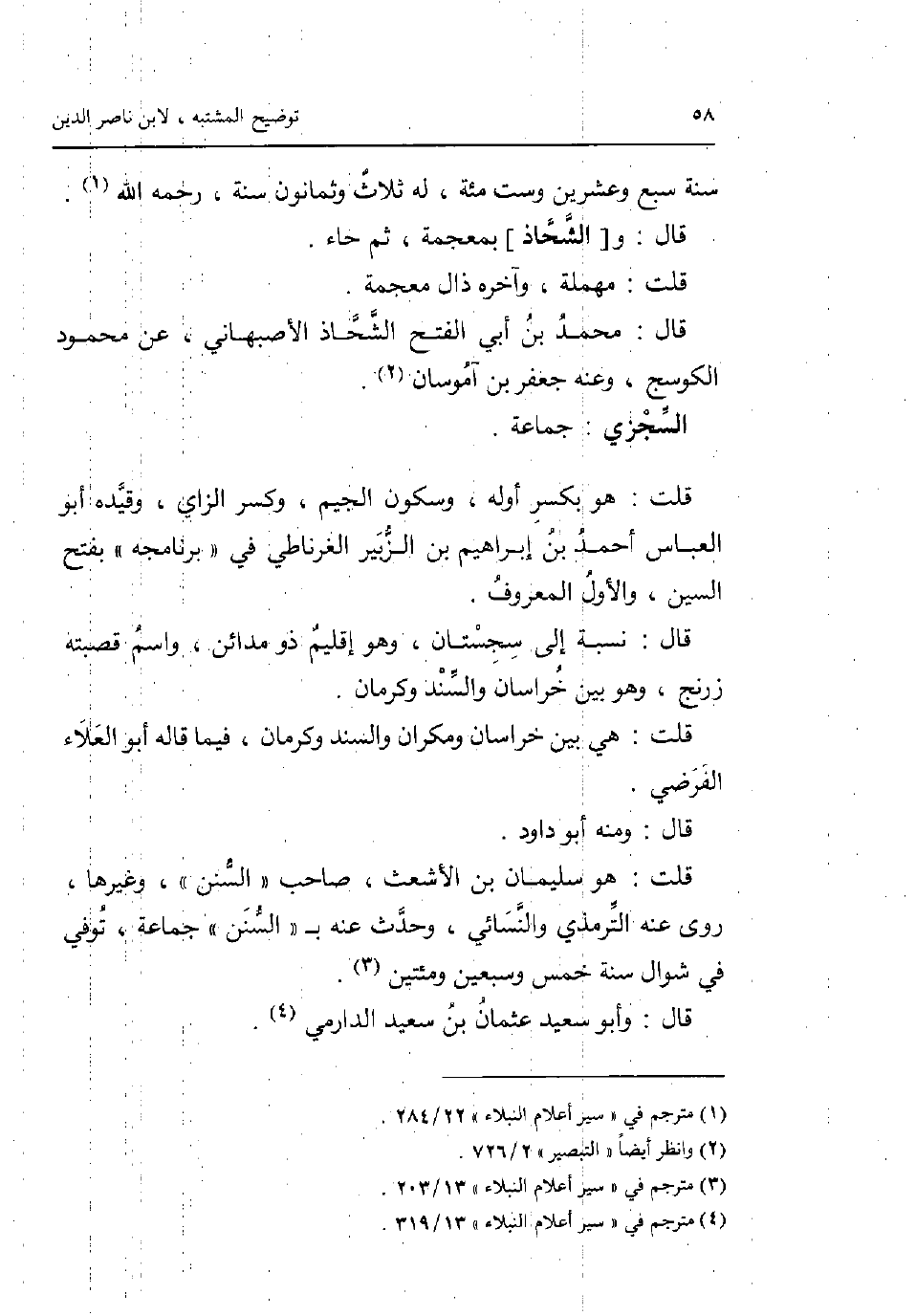 سنة سبع وَعشْرين وست مئة لَهُ ثَلَاث وَثَمَانُونَ سنة رَحمَه الله. قَالَ: و [الشحاذ] بِمُعْجَمَة ثمَّ حاء. قلت: مُهْملَة وَآخره ذال مُعْجمَة. قَالَ: مُحَمَّد بن أبي الْفَتْح الشحاذ الاصبهاني عَن مَحْمُود الكوسج وَعنهُ جَعْفَر بن آموسان. السجْزِي: جمَاعَة. قلت: هُوَ بِكَسْر اوله وَسُكُون الْجِيم وَكسر الزَّاي وَقَيده أَبُو الْعَبَّاس أَحْمد بن إِبْرَاهِيم بن الزبير الغرناطي فِي برنامجه بِفَتْح السِّين وَالْأول الْمَعْرُوف. قَالَ: نِسْبَة إِلَى سجستان وَهُوَ إقليم ذُو مَدَائِن وَاسم قصبته زرنج وَهُوَ بَين خُرَاسَان والسند وكرمان. قلت: هِيَ بَين خُرَاسَان ومكران والسند وكرمان فِيمَا قلاه أَبُو الْعَلَاء الفرضي. قَالَ: وَمِنْه أَبُو دَاوُد. قلت: هُوَ سُلَيْمَان بن الاشعث صَاحب السّنَن وَغَيرهَا روى عَنهُ التِّرْمِذِيّ وَالنَّسَائِيّ وَحدث عَنهُ ب السّنَن جمَاعَة توفّي فِي شَوَّال سنة خمس وَسبعين ومئتين. قَالَ: وَأَبُو سعيد عُثْمَان بن سعيد الدَّارمِيّ.
