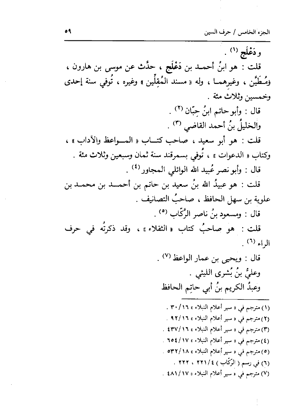 ودعلج قلت: هُوَ ابْن أَحْمد بن دعْلج حدث عَن مُوسَى بن هَارُون ومطين وَغَيرهمَا وَله مُسْند المقلين وَغَيره توفّي سنة إِحْدَى وَخمسين وَثَلَاث مئة. قَالَ: وَأَبُو حَاتِم ابْن حبَان. والخليل بن أَحْمد القَاضِي. قلت: هُوَ أَبُو سعيد صَاحب كتاب المواعظ والآداب وَكتاب الدَّعْوَات توفّي بسمرقند سنة ثَمَان وَسبعين وَثَلَاث مئة. قَالَ: وَأَبُو نصر عبيد الله الوائلي المجاور. قلت: هُوَ عبيد الله بن سعيد بن حَاتِم بن أَحْمد بن مُحَمَّد بن علوِيَّة بن سهل الْحَافِظ صَاحب التصانيف. قَالَ: ومسعود بن نَاصِر الركاب. قلت: هُوَ صَاحب كتاب الثُّقَلَاء وَقد ذكرته فِي حرف الرَّاء. قَالَ: وَيحيى بن عمار الْوَاعِظ. وَعلي بن بشرى اللَّيْثِيّ. وَعبد الْكَرِيم بن أبي حَاتِم الْحَافِظ