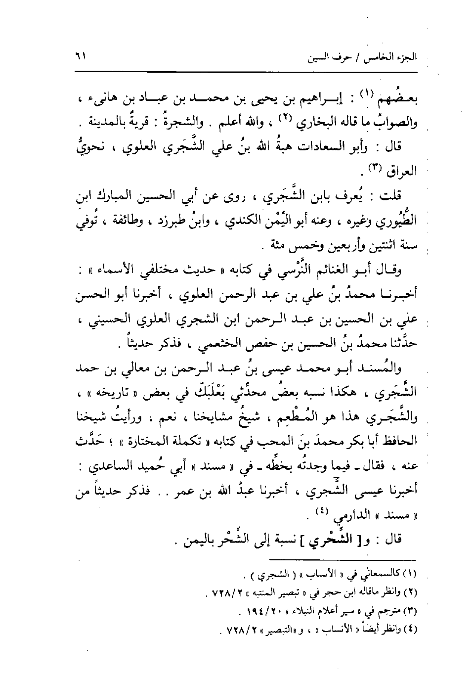 بَعضهم: إِبْرَاهِيم بن يحيى بن مُحَمَّد بن عباد بن هَانِئ وَالصَّوَاب مَا قَالَه البُخَارِيّ وَالله اعْلَم. والشجرة: قَرْيَة بِالْمَدِينَةِ. قَالَ: وَأَبُو السعادات هبة الله بن عَليّ الشجري الْعلوِي نحوي الْعرَاق. قلت: يعرف بِابْن الشجري روى عَن أبي الْحُسَيْن الْمُبَارك ابْن الطيوري وَغَيره وَعنهُ أَبُو الْيمن الْكِنْدِيّ وَابْن طبرزد وَطَائِفَة توفّي سنة اثْنَتَيْنِ وَأَرْبَعين وَخمْس مئة. وَقَالَ أَبُو الْغَنَائِم النَّرْسِي فِي كِتَابه حَدِيث مختلفي الاسماء: أخبرنَا مُحَمَّد بن عَليّ بن عبد الرَّحْمَن الْعلوِي أخبرنَا أَبُو الْحسن عَليّ بن الْحُسَيْن بن عبد الرَّحْمَن ابْن الشجري الْعلوِي الْحُسَيْنِي حَدثنَا مُحَمَّد بن الْحُسَيْن بن حَفْص الْخَثْعَمِي فَذكر حَدِيثا. والمسند أَبُو مُحَمَّد عِيسَى بن عبد الرَّحْمَن بن معالي بن حمد الشجري هَكَذَا نسبه بعض محدثي بعلبك فِي بعض تَارِيخه والشجري هَذَا هُوَ الْمطعم شيخ مَشَايِخنَا نعم وَرَأَيْت شَيخنَا الْحَافِظ أَبَا بكر مُحَمَّد بن الْمُحب فِي كِتَابه تَكْمِلَة المختارة حدث عَنهُ فَقَالَ - فِيمَا وجدته بِخَطِّهِ - فِي مُسْند أبي حميد السَّاعِدِيّ: أخبرنَا عِيسَى الشجري أخبرنَا عبد الله بن عمر. . فَذكر حَدِيثا من مُسْند الدَّارمِيّ. قَالَ: و [الشحري] نِسْبَة إِلَى الشحر بِالْيمن.