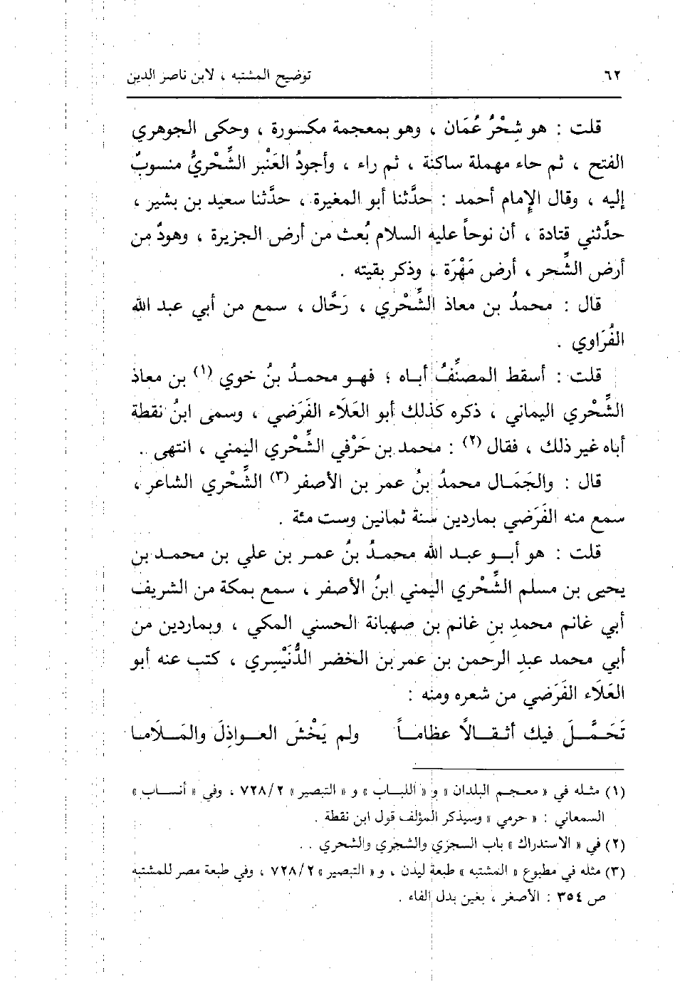 قلت: هُوَ شحر عمان وَهُوَ بِمُعْجَمَة مَكْسُورَة وَحكى الْجَوْهَرِي الْفَتْح ثمَّ حاء مُهْملَة سَاكِنة ثمَّ رَاء وأجود العنبر الشحري مَنْسُوب إِلَيْهِ وَقَالَ الإِمَام أَحْمد: حَدثنَا أَبُو الْمُغيرَة حَدثنَا سعيد بن بشير حَدثنِي قَتَادَة أَن نوحًا عَلَيْهِ السَّلَام بعث من أَرض الجزيرة وَهود من أَرض الشحر أَرض مهرَة وَذكر بَقِيَّته. قَالَ: مُحَمَّد بن معَاذ الشحري رحال سمع من أبي عبد الله الفراوي. قلت: أسقط المُصَنّف اباه فَهُوَ مُحَمَّد بن خوي بن معَاذ الشحري الْيَمَانِيّ ذكره كَذَلِك أَبُو الْعَلَاء الفرضي وسمى ابْن نقطة اباه غير ذَلِك فَقَالَ: مُحَمَّد بن حرفي الشحري اليمني انْتهى. قَالَ: وَالْجمال مُحَمَّد بن عمر بن الاصفر الشحري الشَّاعِر سمع مِنْهُ الفرضي بماردين سنة ثَمَانِينَ وست مئة. قلت: هُوَ أَبُو عبد الله مُحَمَّد بن عمر بن عَليّ بن مُحَمَّد بن يحيى بن مُسلم الشحري اليمني ابْن الاصفر سمع بِمَكَّة من الشريف أبي غَانِم مُحَمَّد بن غَانِم بن صهبانة الحسني الْمَكِّيّ وبماردين من أبي مُحَمَّد عبد الرَّحْمَن بن عمر بن الْخضر الدنيسري كتب عَنهُ أَبُو الْعَلَاء الفرضي من شعره وَمِنْه: