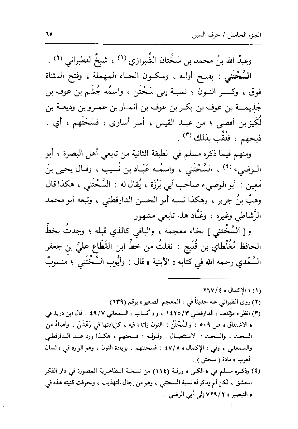 وَعبد الله بن مُحَمَّد بن سختان الشِّيرَازِيّ شيخ للطبراني السحتني: بِفَتْح اوله وَسُكُون الْحَاء الْمُهْملَة وَفتح الْمُثَنَّاة فَوق وَكسر النُّون نِسْبَة إِلَى سحتن واسْمه جشم بن عَوْف بن جذيمة بن عَوْف بن بكر بن عَوْف بن انمار بن عَمْرو بن وَدِيعَة بن لكيز بن افصى من عبد الْقَيْس اسر اسارى فسحتهم أَي: ذبحهم فلقب بذلك. وَمِنْهُم فِيمَا ذكره مُسلم فِي الطَّبَقَة الثَّانِيَة من تَابِعِيّ أهل الْبَصْرَة أَبُو الوضئ السحتني واسْمه عباد بن نسيب وَقَالَ يحيى بن معِين: أَبُو الوضيء صَاحب أبي بَرزَة يُقَال لَهُ: السحتني هَكَذَا قَالَ وهب بن جرير وَهَكَذَا نسبه أَبُو الْحسن الدَّارَقُطْنِيّ وَتَبعهُ أَبُو مُحَمَّد الرشاطي وَغَيره وَعباد هَذَا تَابِعِيّ مَشْهُور. و [السختني] بخاء مُعْجمَة وَالْبَاقِي كَالَّذي قبله وجدت بِخَط الْحَافِظ مغلطاي بن قليج: نقلت من خطّ ابْن القطاع عَليّ بن جَعْفَر السَّعْدِيّ رَحمَه الله فِي كِتَابه الابنية قَالَ: وَأَيوب السختني مَنْسُوب