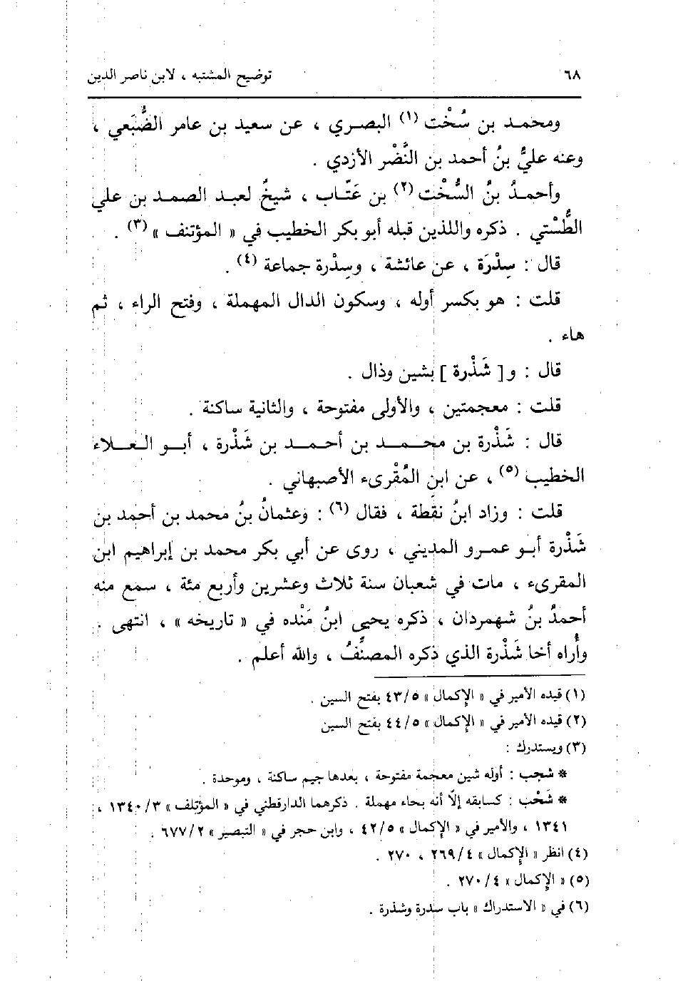 وَمُحَمّد بن سخت الْبَصْرِيّ عَن سعيد بن عَامر الضبعِي وَعنهُ عَليّ بن أَحْمد بن النَّضر الازدي. وَأحمد بن السخت بن عتاب شيخ لعبد الصَّمد بن عَليّ الطستي. ذكره واللذين قبله ابوبكر الْخَطِيب فِي المؤتنف. قَالَ: سِدْرَة عَن عَائِشَة وسدرة جمَاعَة. قلت: هُوَ بِكَسْر اوله وَسُكُون الدَّال الْمُهْملَة وَفتح الرَّاء ثمَّ هَاء. قَالَ: و [شذرة] بشين وذال. قلت معجمتين الأولى مَفْتُوحَة وَالثَّانيَِة سَاكِنة. قَالَ: شذرة بن مُحَمَّد بن أَحْمد بن شذرة أَبُو الْعَلَاء الْخَطِيب عَن ابْن الْمُقْرِئ الاصبهاني. قلت: وَزَاد بن نقطة فَقَالَ: وَعُثْمَان بن مُحَمَّد بن أَحْمد بن شذرة أَبُو عَمْرو الْمَدِينِيّ روى عَن أبي بكر مُحَمَّد بن إِبْرَاهِيم ابْن الْمُقْرِئ مَاتَ فِي شعْبَان سنة ثَلَاث وَعشْرين وَأَرْبع مئة سمع مِنْهُ أَحْمد بن شهمردان ذكره يحيى ابْن مَنْدَه فِي تَارِيخه انْتهى. وَأرَاهُ اخا شذرة الَّذِي ذكره المُصَنّف وَالله اعْلَم.