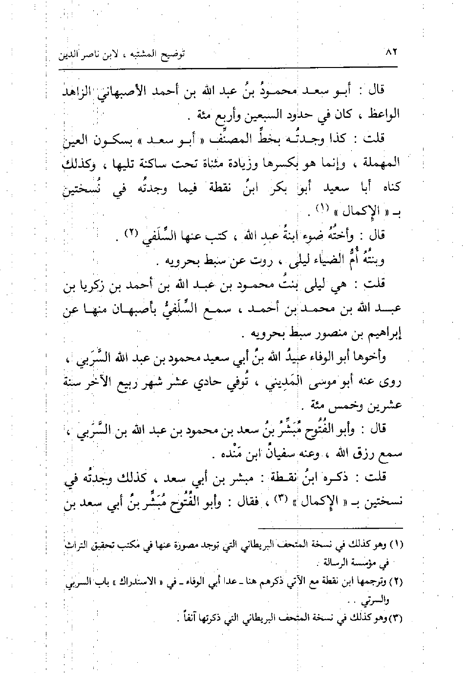 قَالَ: أَبُو سعد مَحْمُود بن عبد الله بن أَحْمد الاصبهاني الزَّاهِد الْوَاعِظ كَانَ فِي حُدُود السّبْعين وَأَرْبع مئة. قلت: كَذَا وجدته بِخَط المُصَنّف أَبُو سعد بِسُكُون الْعين الْمُهْملَة وَإِنَّمَا هُوَ بِكَسْرِهَا وَزِيَادَة مثناة تَحت سَاكِنة تَلِيهَا وَكَذَلِكَ كناه أَبَا سعيد أَبُو بكر ابْن نقطة فِيمَا وجدته فِي نسختين ب الْإِكْمَال. قَالَ: واخته ضوء ابْنة عبد الله كتب عَنْهَا السلَفِي. وبنته أم الضياء ليلى رَوَت عَن سبط بحرويه. قلت: هِيَ ليلى بنت مَحْمُود بن عبد الله بن أَحْمد بن زَكَرِيَّا بن عبد الله بن مُحَمَّد بن أَحْمد سمع السلَفِي باصبهان مِنْهَا عَن إِبْرَاهِيم من مَنْصُور سبط بحرويه. وأخوها أَبُو الْوَفَاء عبيد الله بن أبي سعيد مَحْمُود بن عبد الله السربي روى عَنهُ أَبُو مُوسَى الْمَدِينِيّ توفّي حادي عشر شهر ربيع الآخر سنة عشْرين وَخمْس مئة. قَالَ: وَأَبُو الْفتُوح مُبشر بن سعد بن مَحْمُود بن عبد الله بن السربي سمع رزق الله وَعنهُ سُفْيَان ابْن مَنْدَه. قلت: ذكره ابْن نقطة: مُبشر بن أبي سعد كَذَلِك وجدته فِي نسختين ب الْإِكْمَال فَقَالَ: وَأَبُو الْفتُوح مُبشر بن أبي سعد بن