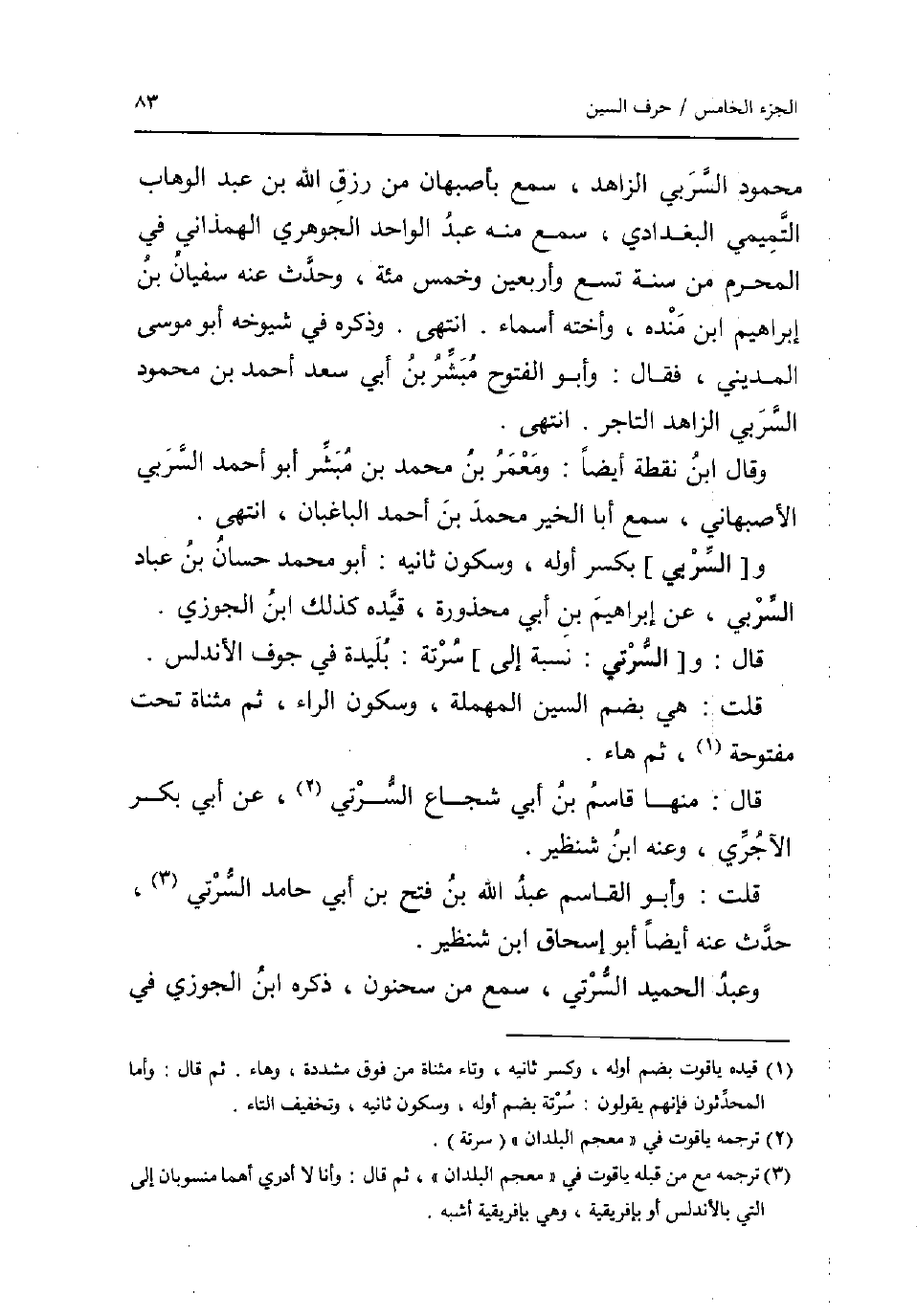 مَحْمُود السربي الزَّاهِد سمع بأصبهان من رزق الله بن عبد الْوَهَّاب التَّمِيمِي الْبَغْدَادِيّ سمع مِنْهُ عبد الْوَاحِد الْجَوْهَرِي الهمذاني فِي الْمحرم من سنة تسع واربعين وَخمْس مئة وَحدث عَنهُ سُفْيَان بن إِبْرَاهِيم ابْن مَنْدَه واخته أَسمَاء. انْتهى. وَذكره فِي شُيُوخه أَبُو مُوسَى الْمَدِينِيّ فَقَالَ: وَأَبُو الْفتُوح مُبشر بن أبي سعد أَحْمد بن مَحْمُود السربي الزَّاهِد التَّاجِر. انْتهى. وَقَالَ ابْن نقطة أَيْضا: وَمعمر بن مُحَمَّد بن مُبشر أَبُو أَحْمد السربي الاصبهاني سمع أَبَا الْخَيْر مُحَمَّد بن أَحْمد الباغبان انْتهى. و [السربي] بِكَسْر اوله وَسُكُون ثَانِيَة: أَبُو مُحَمَّد حسان بن عباد السربي عَن إِبْرَاهِيم بن أبي مَحْذُورَة قَيده كَذَلِك ابْن الْجَوْزِيّ. قَالَ: و [السرتي: نِسْبَة إِلَى] سرتة: بليدَة فِي جَوف الأندلس. قلت: هِيَ بِضَم السِّين الْمُهْملَة وَسُكُون الرَّاء ثمَّ مثناة تَحت مَفْتُوحَة ثمَّ هَاء. قَالَ: مِنْهَا قَاسم بن أبي شُجَاع السرتي عَن أبي بكر الاجري وَعنهُ ابْن شنظير. قلت: وَأَبُو الْقَاسِم عبد الله بن فتح بن أبي حَامِد السرتي حدث عَنهُ أَيْضا أَبُو إِسْحَاق ابْن شنظير. وَعبد الحميد السرتي سمع من سَحْنُون ذكره ابْن الْجَوْزِيّ فِي
