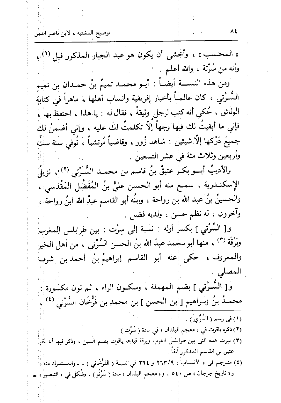 الْمُحْتَسب واخشى أَن يكون هُوَ عبد الْجَبَّار الْمَذْكُور قبل وانه من سرته وَالله اعْلَم. وَمن هَذِه النِّسْبَة أَيْضا: أَبُو مُحَمَّد تَمِيم بن حمدَان بن تَمِيم السرتي كَانَ عَالما بأخبار افريقية وانساب اهلها ماهرا فِي كِتَابه الوثائق حُكيَ انه كتب لرجل وَثِيقَة فَقَالَ لَهُ: يَا هَذَا احتفظ بهَا فَإِنِّي مَا ابقيت لَك فِيهَا وَجها إِلَّا تَكَلَّمت لَك عَلَيْهِ واني اضمن لَك جَمِيع دركها الا شَيْئَيْنِ: شَاهد زور وقاضيا مرتشيا توفّي سنة سِتّ واربعين وَثَلَاث مئة فِي عشر التسعين. والأديب أَبُو بكر عَتيق بن قَاسم بن مُحَمَّد السرتي نزيل الْإسْكَنْدَريَّة سمع مِنْهُ أَبُو الْحُسَيْن عَليّ بن الْمفضل الْمَقْدِسِي وَالْحُسَيْن بن عبد الله بن رَوَاحَة وَابْنه أَبُو الْقَاسِم عبد الله ابْن رَوَاحَة وَآخَرُونَ لَهُ نظم حسن ولديه فضل. و [السرتي] بِكَسْر اوله: نِسْبَة إِلَى سرت: بَين طرابلس الْمغرب وبرقة مِنْهَا أَبُو مُحَمَّد عبد الله بن الْحسن السرتي من أهل الْخَيْر وَالْمَعْرُوف حكى عَنهُ أَبُو الْقَاسِم إِبْرَاهِيم بن أَحْمد بن شرف الْمصلى. و [السرني] بِضَم الْمُهْملَة وَسُكُون الرَّاء ثمَّ نون مَكْسُورَة: مُحَمَّد بن إِبْرَاهِيم [بن الْحسن] بن مُحَمَّد بن فرخان السرني