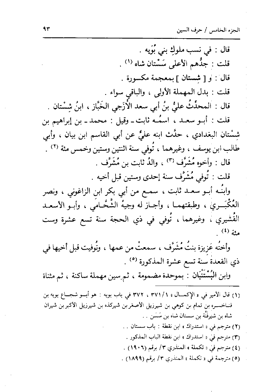 قَالَ: فِي نسب مُلُوك بني بويه. قلت: جدهم الْأَعْلَى سستان شاه. قَالَ: و [شستان] بِمُعْجَمَة مَكْسُورَة. قلت: بدل الْمُهْملَة الأولى وَالْبَاقِي سَوَاء. قَالَ: الْمُحدث عَليّ بن أبي سعد الازجي الخباز ابْن شستان. قلت: أَبُو سعد اسْمه ثَابت - وَقيل: مُحَمَّد - بن إِبْرَاهِيم بن شستان الْبَغْدَادِيّ حدث ابْنه عَليّ عَن أبي الْقَاسِم ابْن بَيَان وابي طَالب ابْن يُوسُف وَغَيرهمَا توفّي سنة اثْنَتَيْنِ وَسِتِّينَ وَخمْس مئة. قَالَ: واخوه مشرف وَالِد ثَابت بن مشرف. قلت: توفّي مشرف سنة إِحْدَى وَسِتِّينَ قبل أَخِيه. وَابْنه أَبُو سعد ثَابت سمع من أبي بكر ابْن الزَّاغُونِيّ وَنصر العكبري وطبقتهما واجاز لَهُ وجيه الشحامي وَأَبُو الاسعد الْقشيرِي وَغَيرهمَا توفّي فِي ذِي الْحجَّة سنة تسع عشرَة وست مئة. واخته عزيزة بنت مشرف سَمِعت من عَمها وَتوفيت قبل اخيها فِي ذِي الْقعدَة سنة تسع عشرَة الْمَذْكُورَة. وَابْن البستنبان: بموحدة مَضْمُومَة ثمَّ سين مُهْملَة سَاكِنة ثمَّ مثناة