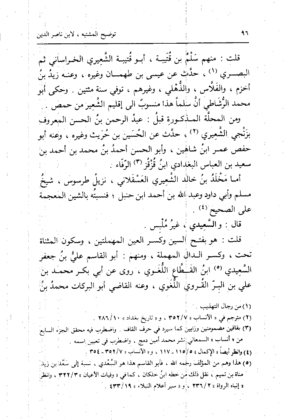 قلت: مِنْهُم سلم بن قُتَيْبَة أَبُو قُتَيْبَة الشعيري الْخُرَاسَانِي ثمَّ الْبَصْرِيّ حدث عَن عِيسَى بن طهْمَان وَغَيره وَعنهُ زيد بن اخزم وَالْفَلَّاس والذهلي وَغَيرهم توفّي سنة مئتين. وَحكى أَبُو مُحَمَّد الرشاطي أَن سلما هَذَا مَنْسُوب إِلَى إقليم الشّعير من حمص. وَمن الْمحلة الْمَذْكُورَة قبل: عبد الرَّحْمَن بن الْحسن الْمَعْرُوف بزنجي الشعيري حدث عَن الْحُسَيْن بن حُرَيْث وَغَيره وَعنهُ أَبُو حَفْص عمر ابْن شاهين وَأَبُو الْحسن أَحْمد بن مُحَمَّد بن أَحْمد بن سعيد بن الْعَبَّاس الْبَغْدَادِيّ ابْن قزقزة الرفاء. أما مخلد بن خَالِد الشعيري الْعَسْقَلَانِي نزيل طرسوس شيخ مُسلم وابي دَاوُد وَعبد الله بن أَحْمد ابْن حَنْبَل فنسبته بالشين الْمُعْجَمَة على الصَّحِيح. قَالَ: والسعيدي غير ملبس. قلت: هُوَ بِفَتْح السِّين وَكسر الْعين الْمُهْمَلَتَيْنِ وَسُكُون الْمُثَنَّاة تَحت وَكسر الدَّال الْمُهْملَة وَمِنْهُم: أَبُو الْقَاسِم عَليّ بن جَعْفَر السعيدي ابْن القطاع اللّغَوِيّ روى عَن أبي بكر مُحَمَّد بن عَليّ بن الْبر الْقَرَوِي اللّغَوِيّ وَعنهُ القَاضِي أَبُو البركات مُحَمَّد بن