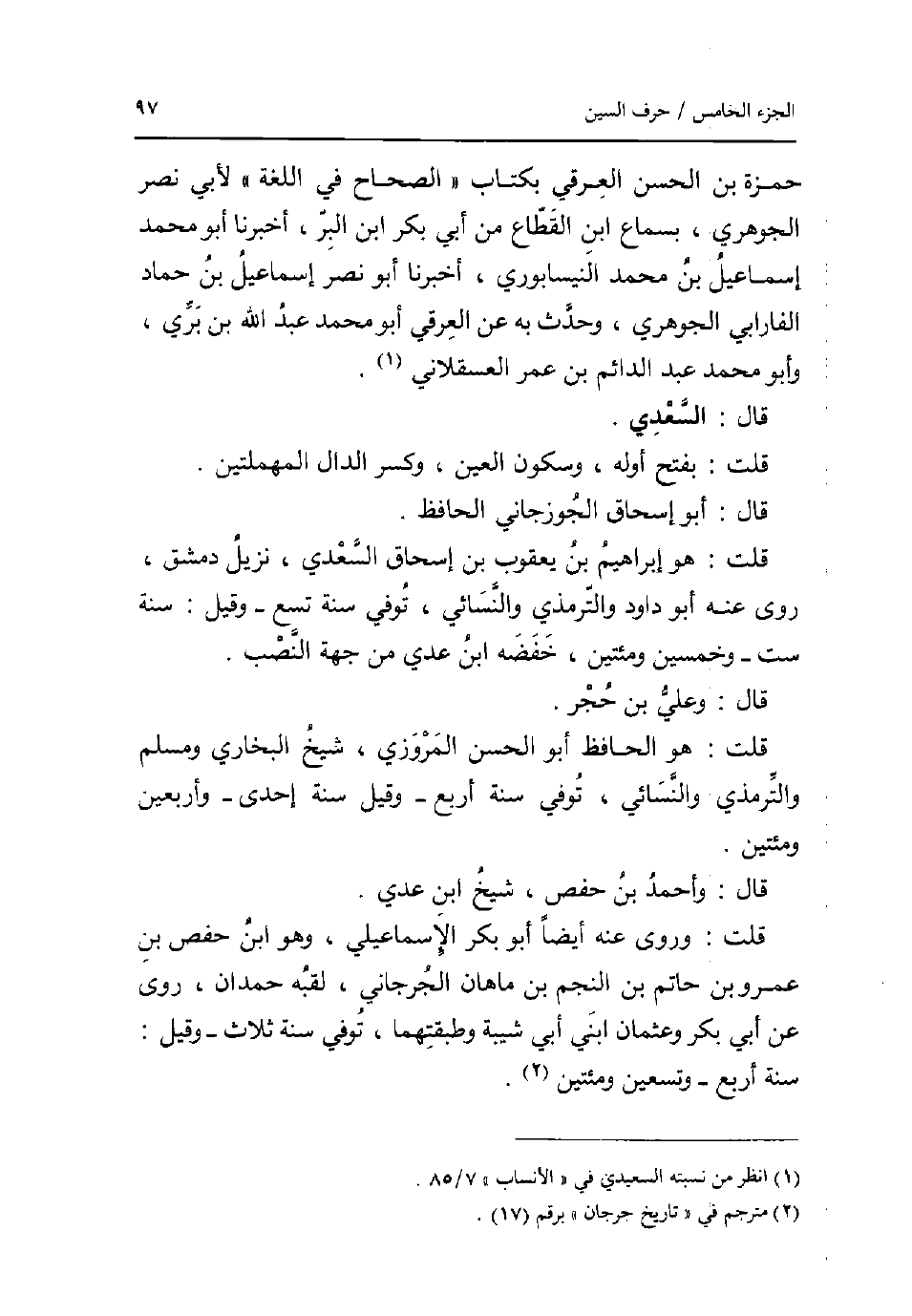 حَمْزَة بن الْحسن العرقي بِكِتَاب الصِّحَاح فِي اللُّغَة لابي نصر الْجَوْهَرِي بِسَمَاع ابْن القطاع من أبي بكر ابْن الْبر أخبرنَا أَبُو مُحَمَّد إِسْمَاعِيل بن مُحَمَّد النَّيْسَابُورِي أخبرنَا أَبُو نصر إِسْمَاعِيل بن حَمَّاد الفارابي الْجَوْهَرِي وَحدث بِهِ عَن العرقي أَبُو مُحَمَّد عبد الله بن بري وَأَبُو مُحَمَّد عبد الدَّائِم بن عمر الْعَسْقَلَانِي. قَالَ السَّعْدِيّ. قلت: بِفَتْح اوله وَسُكُون الْعين وَكسر الدَّال الْمُهْمَلَتَيْنِ. قَالَ: أَبُو إِسْحَاق الْجوزجَاني الْحَافِظ. قلت: هُوَ إِبْرَاهِيم بن يَعْقُوب بن إِسْحَاق السَّعْدِيّ نزيل دمشق روى عَنهُ أَبُو دَاوُد وَالتِّرْمِذِيّ وَالنَّسَائِيّ توفّي سنة تسع - وَقيل: سنة سِتّ - وَخمسين ومئتين خفضة ابْن عدي من جِهَة النصب. قَالَ: وَعلي بن حجر. قلت: هُوَ الْحَافِظ أَبُو الْحسن الْمروزِي شيخ البُخَارِيّ وَمُسلم وَالتِّرْمِذِيّ وَالنَّسَائِيّ توفّي سنة أَربع - وَقيل سنة إِحْدَى - واربعين ومئتين. قَالَ: وَاحْمَدْ بن حَفْص شيخ ابْن عدي. قلت: وروى عَنهُ أَيْضا أَبُو بكر الاسماعيلي وَهُوَ ابْن حَفْص بن عَمْرو بن حَاتِم بن النَّجْم بن ماهان الْجِرْجَانِيّ لقبه حمدَان روى عَن أبي بكر وَعُثْمَان ابْني أبي شيبَة وطبقتهما توفّي سنة ثَلَاث - وَقيل: سنة أَربع - وَتِسْعين ومئتين.