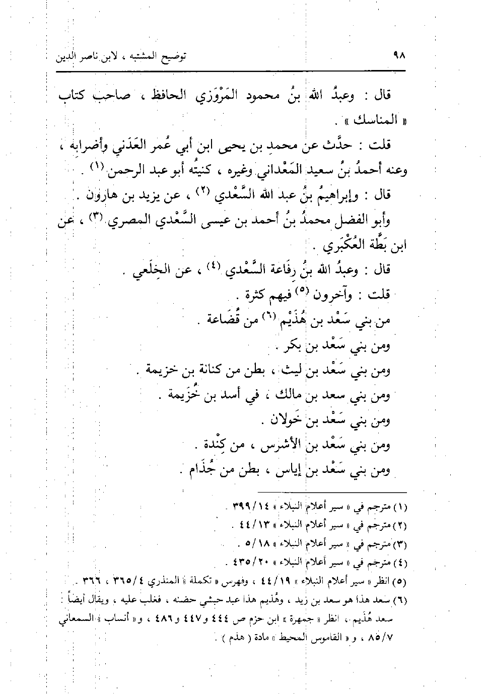 قَالَ: وَعبد الله بن مَحْمُود الْمروزِي الْحَافِظ صَاحب كتاب الْمَنَاسِك. قلت: حدث عَن مُحَمَّد بن يحيى ابْن أبي عمر الْعَدنِي واضرابه وَعنهُ أَحْمد بن سعيد المعداني وَغَيره كنيته أَبُو عبد الرَّحْمَن. قَالَ: وابراهيم بن عبد الله السَّعْدِيّ عَن يزِيد بن هَارُون. وَأَبُو الْفضل مُحَمَّد بن أَحْمد بن عِيسَى السَّعْدِيّ الْمصْرِيّ عَن ابْن بطة العكبري. قَالَ: وَعبد الله بن رِفَاعَة السَّعْدِيّ عَن الخلعي. قلت: وَآخَرُونَ فيهم كَثْرَة. من بني سعد بن هذيم من قضاعة. وَمن بني سعد بن بكر. وَمن بني سعد بن لَيْث بطن من كنَانَة بن خُزَيْمَة. وَمن بني سعد بن مَالك فِي أَسد بن خُزَيْمَة. وَمن بني سعد بن خولان. وَمن بني سعد بن الاشرس من كِنْدَة. وَمن بني سعد بن اياس بطن من جذام.