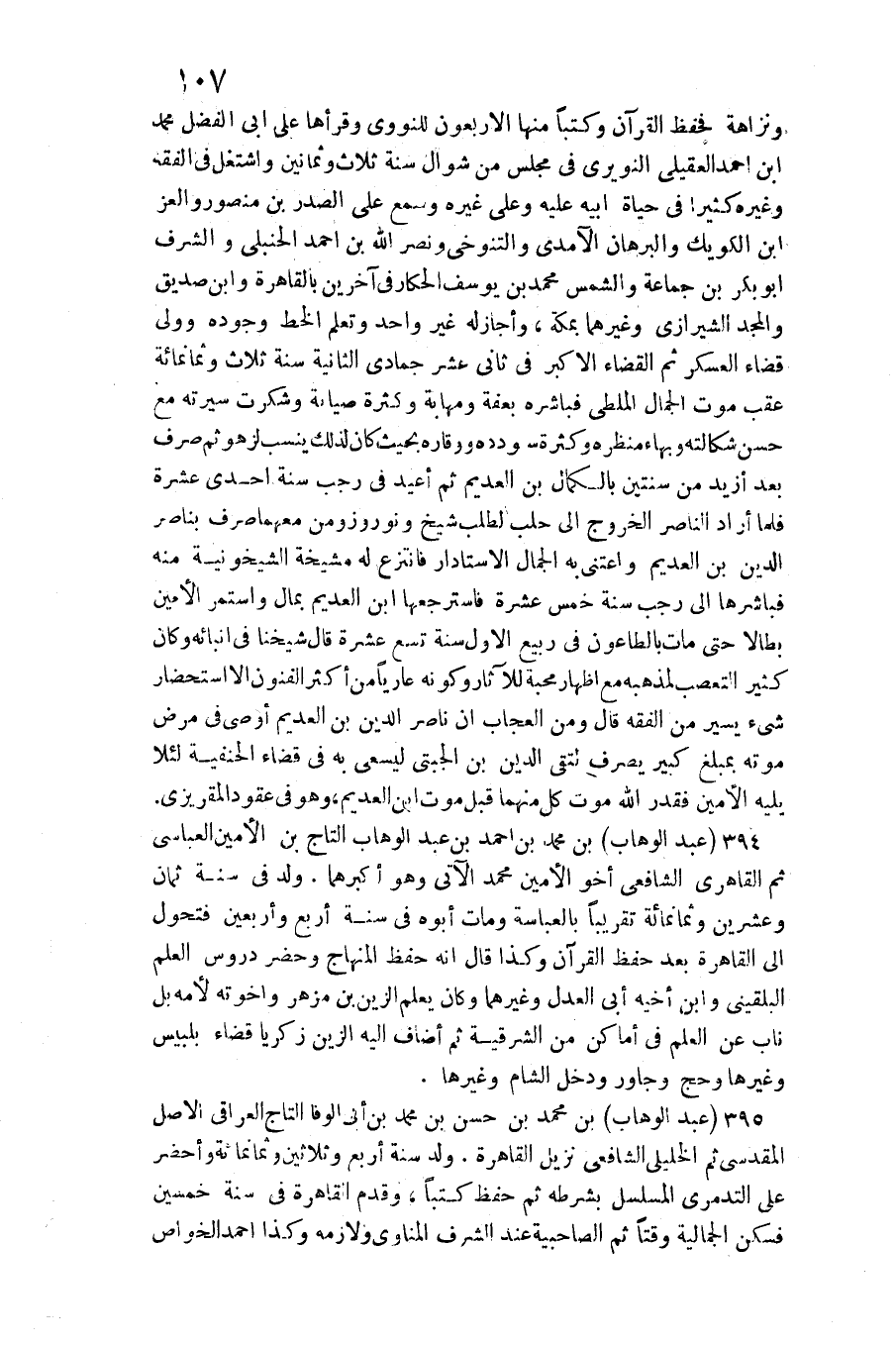 ونزاهة وَحفظ الْقُرْآن وكتبا مِنْهَا الْأَرْبَعُونَ للنووي وَقرأَهَا على أبي الْفضل مُحَمَّد بن أَحْمد الْعقيلِيّ النويري فِي مجْلِس من شَوَّال سنة ثَلَاث وَثَمَانِينَ واشتغل فِي الْفِقْه وَغَيره كثيرا فِي حَيَاة أَبِيه عَلَيْهِ وعَلى غَيره وَسمع على الصَّدْر بن مَنْصُور والعز بن الكويك والبرهان الْآمِدِيّ والتنوخي وَنصر الله بن أَحْمد الْحَنْبَلِيّ والشرف أَبُو بكر بن جمَاعَة وَالشَّمْس مُحَمَّد بن يُوسُف الحكار فِي آخَرين بِالْقَاهِرَةِ وَابْن صديق وَالْمجد الشِّيرَازِيّ وَغَيرهمَا بِمَكَّة، وَأَجَازَ لَهُ غير وَاحِد وَتعلم الْخط وجوده وَولي قَضَاء الْعَسْكَر ثمَّ الْقَضَاء الْأَكْبَر فِي ثَانِي عشر جُمَادَى الثَّانِيَة سنة ثَلَاث وَثَمَانمِائَة عقب موت جمال الْمَلْطِي فباشره بعفة ومهابة وَكَثْرَة صِيَانة وشكرت سيرته مَعَ حسن شكالته بهاء منظره وَكَثْرَة ودده ووقاره بِحَيْثُ كَانَ لذَلِك ينْسب لزهو ثمَّ صرف بعد أَزِيد من سنتَيْن بالكمال بن العديم ثمَّ أُعِيد فِي رَجَب سنة إِحْدَى عشرَة فَلَمَّا أَرَادَ النَّاصِر الْخُرُوج إِلَى حلب لطلب شيخ ونوروز وَمن مَعَهُمَا صرف بناصر الدّين بن العديم واعتنى بِهِ الْجمال الاستادار فَانْتزع لَهُ مشيخة الشيخونية مِنْهُ فباشرها إِلَى رَجَب سنة خمس عشرَة فاسترجعها ابْن العديم بِمَال وَاسْتمرّ الْأمين بطالا حَتَّى مَاتَ بالطاعون فِي ربيع الأول سنة تسع عشرَة قَالَ شَيخنَا فِي أنبائه: وَكَانَ كثير التعصب لمذهبه مَعَ إِظْهَار محبَّة للآثار وَكَونه عَارِيا من أَكثر الْفُنُون إِلَّا استحضار شَيْء يسير من الْفِقْه قَالَ: وَمن العجاب أَن نَاصِر الدّين بن العديم أوصى فِي مرض مَوته بمبلغ كَبِير يصرف لتقي الدّين)
