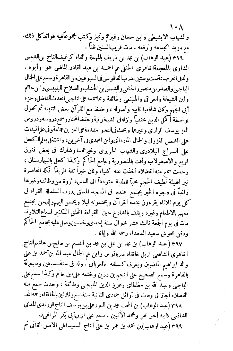 عبد الْوَهَّاب بن مُحَمَّد بن طريف بن مُهْملَة وَالْفَاء كرغيف التَّاج بن الشَّمْس الشاوي بِالْمُعْجَمَةِ القاهري الْحَنَفِيّ عَم أَحْمد بن عبد الْقَادِر الْمَاضِي هُوَ وَأَبوهُ ولد فِي الْمحرم سنة سِتّ وَسِتِّينَ بدرب الفاقوسي فِي السيوفيين من الْقَاهِرَة وَسمع على الْجمال الْبَاجِيّ والصدر بن الْمَنْصُور الْحَنَفِيّ وَالشَّمْس بن الخشاب وَالصَّلَاح البلبيسي وَابْن حَاتِم وَابْن الشيخة والعراقي والهيثمي وَطَائِفَة مِمَّا سَمعه على النَّاجِي الْمُحدث الْفَاضِل وجزء أبي الجهم وَكَانَ شافعيا كأبيه وأصوله، وَحفظ مَعَ الْقُرْآن بعض التَّنْبِيه ثمَّ تحول بِوَاسِطَة أكمل الدّين حنفيا ونزله فِي الشيخونية وَحفظ الْمُخْتَار وَسمع دروسه ودروس الْعِزّ يُوسُف الرَّازِيّ وَغَيرهمَا وَبحث فِي النَّحْو مُقَدّمَة عَليّ الْعِزّ بن جمَاعَة وَفِي علم الْمِيقَات عَليّ الشَّمْس الغزولي وَالْجمال المارداني وَابْن المجدي فِي آخَرين، واشتغل بِعلم الْكحل على السراج البلادري والشهاب الحريري وَغَيرهمَا وشارك فِي بعض فنون الرّبع والاصطرلاب وأقت بالمنصورية وجامع الْحَاكِم وَكَذَا كحل بالميراستان، وَحدث وَسمع مِنْهُ الْفُضَلَاء أخذت عَنهُ أَشْيَاء وَكَانَ خيرا ثِقَة ظريفا فكه المحاضرة نير الْهَيْئَة لطيف الحجم محبا للطلبة متوددا إِلَى النَّاس ذَا ثروة من وظائفه وَغَيرهَا رَاغِبًا فِي وُجُوه الْخَيْر)