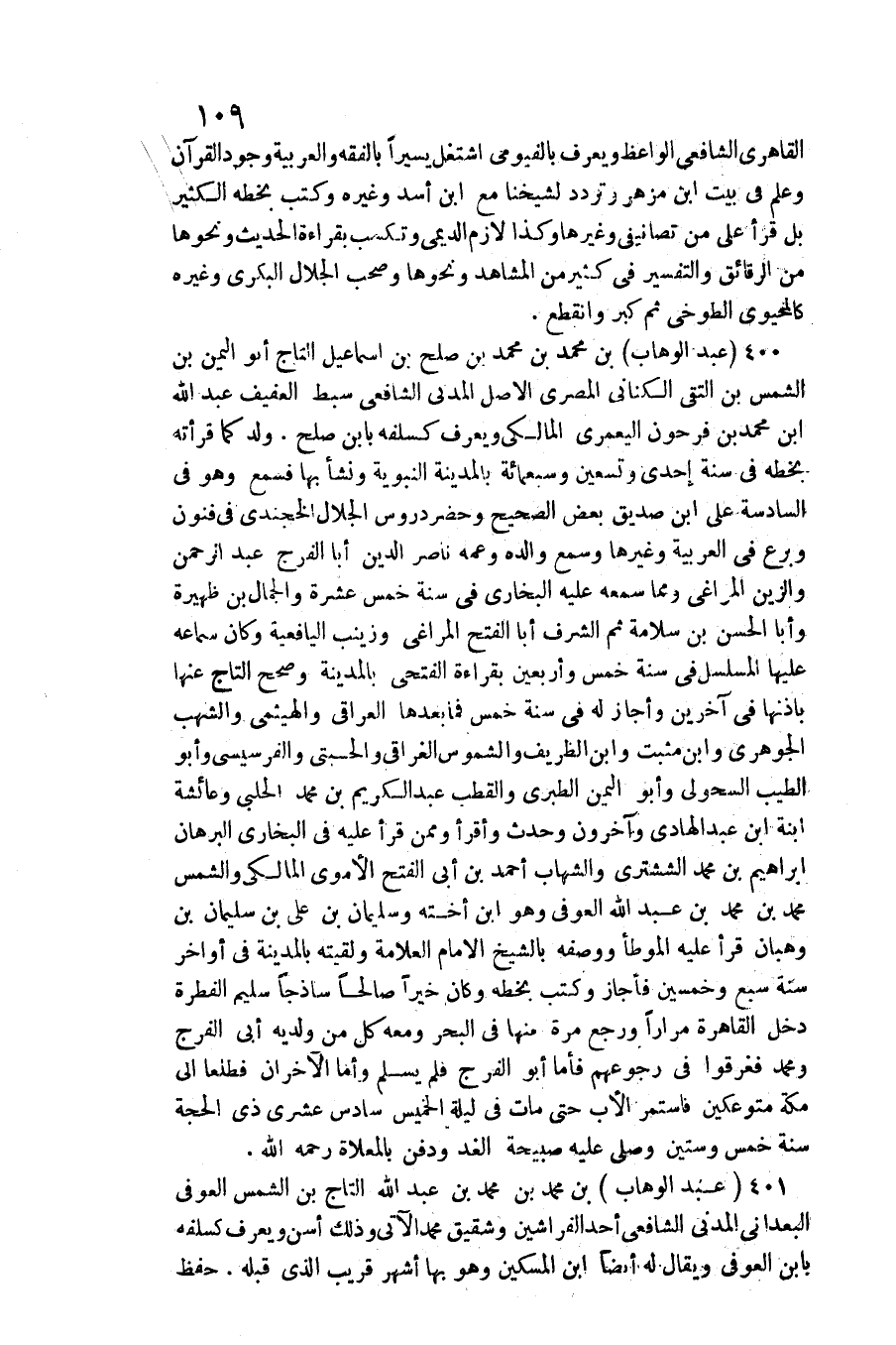 عبد الْوَهَّاب بن مُحَمَّد بن مُحَمَّد بن صلح بن إِسْمَاعِيل التَّاج أَبُو الْيمن بن الشَّمْس بن التقي الْكِنَانِي الْمصْرِيّ الأَصْل الْمدنِي الشَّافِعِي سبط الْعَفِيف عبد الله بن مُحَمَّد بن فَرِحُونَ الْيَعْمرِي الْمَالِكِي وَيعرف كسلفه بِابْن صلح. ولد كَمَا قرأته بِخَطِّهِ فِي سنة إِحْدَى وَتِسْعين وَسَبْعمائة بِالْمَدِينَةِ النَّبَوِيَّة وَنَشَأ بهَا فَسمع وَهُوَ فِي السَّادِسَة على ابْن صديق بعض الصَّحِيح وَحضر دروس الْجلَال الخجندي فِي فنون وبرع فِي الْعَرَبيَّة وَغَيرهَا وَسمع وَالِده وَعَمه نَاصِر الدّين أَبَا الْفرج عبد الرَّحْمَن والزين المراغي وَمِمَّا سَمعه عَلَيْهِ البُخَارِيّ فِي سنة خمس عشرَة وَالْجمال بن ظهيرة وَأَبا الْحسن بن سَلامَة ثمَّ الشّرف أَبَا الْفَتْح المراغي وَزَيْنَب اليافعية وَكَانَ سَمَاعه عَلَيْهَا المسلسل فِي سنة خمس وَأَرْبَعين بِقِرَاءَة الفتحي بِالْمَدِينَةِ وَصحح التَّاج عَنْهَا)