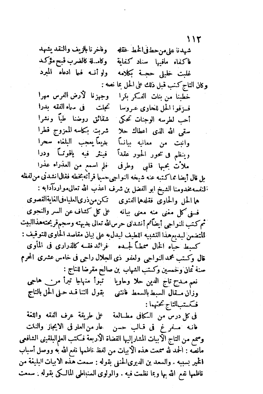 قَالَ: وَكتب مُحَمَّد النواجي ولعفو ذِي الْجلَال راجي فِي خَامِس عشري الْمحرم سنة ثَمَان وَخمسين وَكتب الشهَاب بن صَالح مقرضا للتاج:
