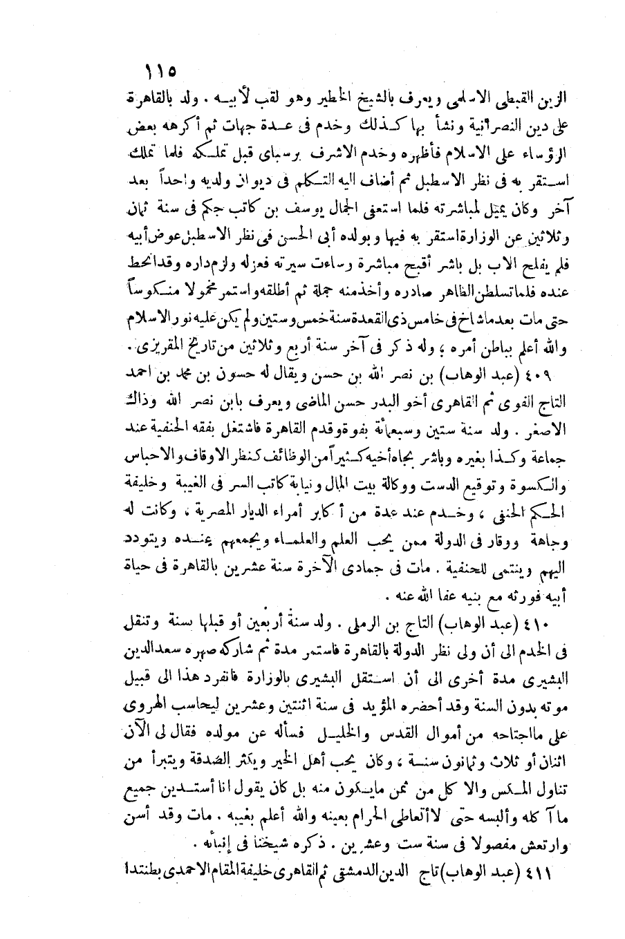عبد الْوَهَّاب التَّاج بن الرَّمْلِيّ. ولد سنة أَرْبَعِينَ أَو قبلهَا بِسنة وتنقل فِي الخدم إِلَى أَن ولي نظر الدولة بِالْقَاهِرَةِ فاستمر مُدَّة شَاركهُ صهره سعد الدّين البشيري مُدَّة أُخْرَى إِلَى أَن اسْتَقل البشيري بالوزارة فَانْفَرد هَذَا إِلَى قبيل مَوته بِدُونِ السّنة وَقد أحضرهُ الْمُؤَيد فِي سنة اثْنَتَيْنِ وَعشْرين ليحاسب الْهَرَوِيّ على مَا اجتاحه من أَمْوَال الْقُدس والخليل فَسَأَلَهُ عَن مولده فَقَالَ لي الْآن اثْنَان أَو ثَلَاث وَثَمَانُونَ سنة، وَكَانَ يحب أهل الْخَيْر وَيكثر الصَّدَقَة ويتبرأ من تنَاول)