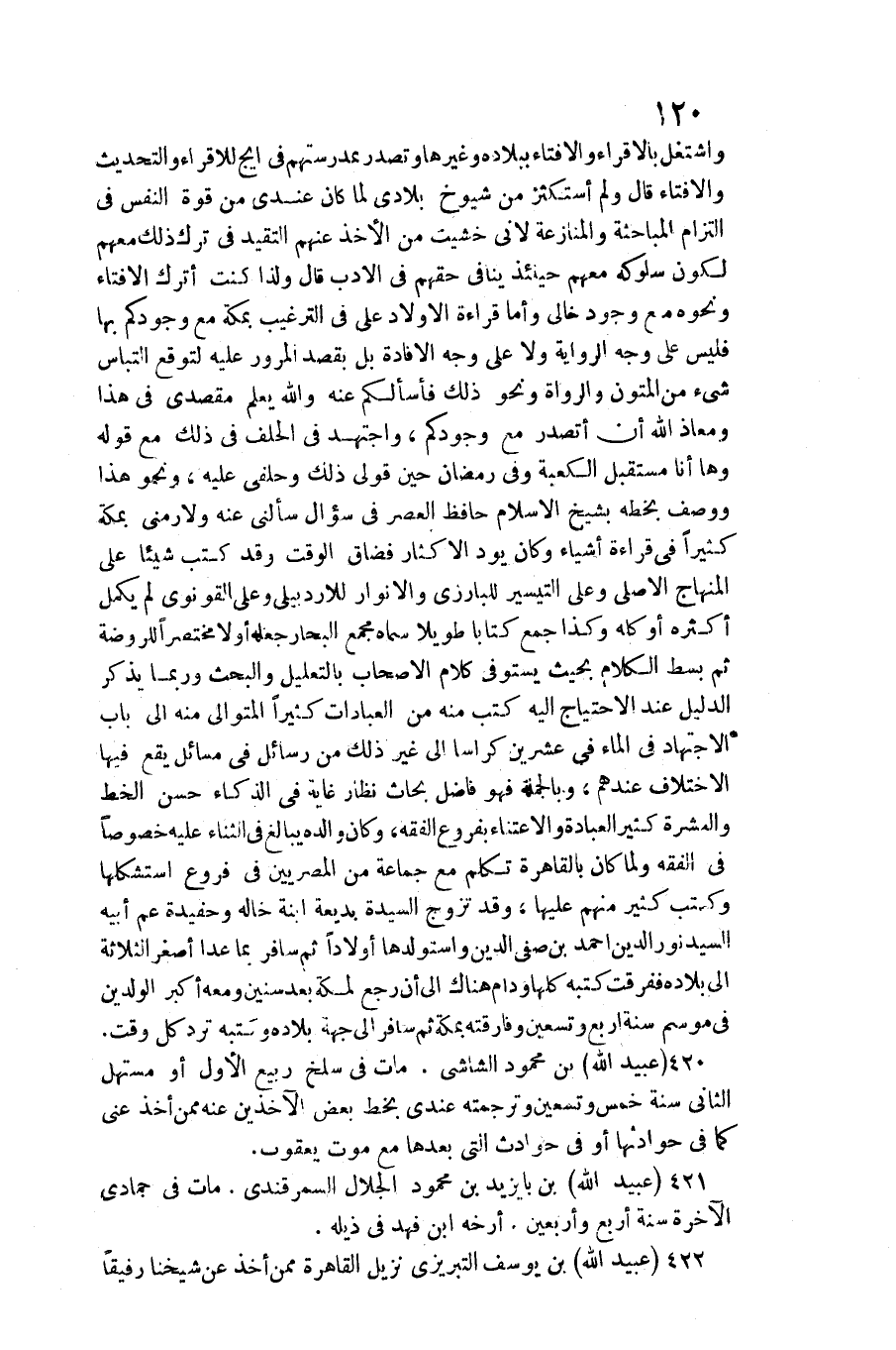 حِين قولي ذَلِك وحلفي عَلَيْهِ وَنَحْو هَذَا وَوصف بِخَطِّهِ بشيخ الْإِسْلَام حَافظ الْعَصْر فِي سُؤال سَأَلَني عَنهُ ولازمني بِمَكَّة كثيرا فِي قِرَاءَة أَشْيَاء وَكَانَ يود الْإِكْثَار فَضَاقَ الْوَقْت وَقد كتب شَيْئا على الْمِنْهَاج الْأَصْلِيّ وعَلى التَّيْسِير للبارزي والأنوار للأردبيلي وَعلي القونوي لم يكمل أَكْثَره أَو كُله وَكَذَا جمع كتابا طَويلا سَمَّاهُ مجمع الْبحار جعله أَولا مُخْتَصرا للروضة ثمَّ بسط الْكَلَام بِحَيْثُ يَسْتَوْفِي كَلَام الْأَصْحَاب بِالتَّعْلِيلِ والبحث وَرُبمَا يذكر الدَّلِيل عِنْد الِاحْتِيَاج إِلَيْهِ كتب مِنْهُ من الْعِبَادَات كثيرا المتوالي مِنْهُ إِلَى بَاب الِاجْتِهَاد فِي المَاء فِي عشْرين كراسا إِلَى غير ذَلِك من رسائل فِي مسَائِل يَقع فِيهَا الِاخْتِلَاف عِنْدهم، وَبِالْجُمْلَةِ فَهُوَ فَاضل بحاث نظار غَايَة فِي الذكاء حسن الْخط وَالْعشرَة كثير الْعِبَادَة والاعتناء بِفُرُوع الْفِقْه، وَكَانَ وَالِده يُبَالغ فِي الثَّنَاء عَلَيْهِ خُصُوصا فِي الْفِقْه وَلما كَانَ بِالْقَاهِرَةِ تكلم مَعَ جمَاعَة من المصريين فِي فروع استشكالها وَكتب كثير مِنْهُم عَلَيْهَا، وَقد تزوج السيدة بديعة ابْنة خَاله وحفيدة عَم أَبِيه السَّيِّد نور الدّين أَحْمد بن صفي الدّين واستولدها أَوْلَادًا ثمَّ سَافر بِمَا عدا أَصْغَر الثَّلَاثَة إِلَى بِلَاده ففرقت كتبه كلهَا ودام هُنَاكَ إِلَى أَن رَجَعَ لمَكَّة بعد سِنِين وَمَعَهُ أكبر الْوَلَدَيْنِ فِي موسم سنة أَربع وَتِسْعين وفارقته بِمَكَّة ثمَّ سَافر إِلَى جِهَة بِلَاده وَكتبه ترد كل وَقت.