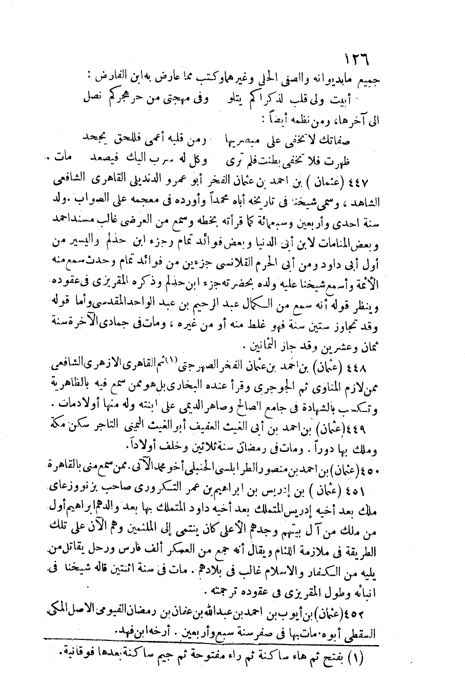 عُثْمَان بن أَحْمد بن عُثْمَان الْفَخر أَبُو عَمْرو الدنديلي القاهري الشَّافِعِي الشَّاهِد، وسمى شَيخنَا فِي تَارِيخه أَبَاهُ مُحَمَّدًا وَأوردهُ فِي مُعْجَمه على الصَّوَاب. ولد سنة إِحْدَى وَأَرْبَعين وَسَبْعمائة كَمَا قرأته بِخَطِّهِ وَسمع من الْعرض غَالب مُسْند أَحْمد وَبَعض المنامات لِابْنِ أبي الدُّنْيَا وَبَعض فَوَائِد تَمام وجزء ابْن حذلم واليسير من أول أبي دَاوُد وَمن أَبَا الْحرم القلانسي جزأين من فَوَائِد تَمام وَحدث سمع مِنْهُ الْأَئِمَّة وأسمع شَيخنَا عَلَيْهِ وَلَده بِحَضْرَتِهِ جُزْء ابْن حذلم وَذكره المقريزي فِي عقوده وَينظر قَوْله أَنه سمع من الْكَمَال عبد الرَّحِيم بن عبد الْوَاحِد الْمَقْدِسِي وَأما قَوْله وَقد تجَاوز سِتِّينَ سنة فَهُوَ غلط مِنْهُ أَو من غَيره، وَمَات فِي جُمَادَى الْآخِرَة سنة ثَمَان وَعشْرين وَقد جَازَ الثَّمَانِينَ.