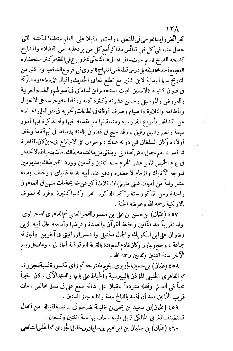 الْفَرَائِض وايساغوجي فِي الْمنطق، وَاسْتمرّ مُقبلا على الْعلم متطلعا لكتبه الَّتِي حصل مِنْهَا فِي كل فن نفائس مذاكرا مَعَ كل من يرد عَلَيْهِ من الْفُضَلَاء والمشايخ كشيخه الشَّيْخ قَاسم حَيْثُ سَافر لَهُ إِلَى هُنَاكَ حَتَّى تميز وبرع فِي الْفِقْه وَكثر استحضاره للمجمع أحد محافيظه بل درس قِطْعَة من الْمِنْهَاج للنووي فِي فروع الشَّافِعِيَّة ولكثير من التَّارِيخ سِيمَا الْبِدَايَة لِأَبْنِ كثير مَعَ تطلع لمعاني الحَدِيث وإقبال على سَمَاعه ومشاركة فِي فنون كَثِيرَة كالأصلين بِحَيْثُ يستحضر ابْن الساعاتي فِي أصولهم والطب والعربية وَالْعرُوض والموسيقى وَحسن عشرته وَكَثْرَة أدبه ورقة طبعه وحرصه على الانعزال والمطالعة والتلاوة وَالصِّيَام وَصرف أوقاته فِي الطَّاعَات وتحريه فِي نقل الْعلم وإعراضه عَن التشاغل بأنواع الفروسية ومتعلقاتها مَعَ تقدمه فِيهَا وَله تذكرة فِيهَا أُمُور مهمة ونظم رَشِيق رَقِيق، وَقد حج فِي غُضُون إِقَامَته بدمياط فِي أبهة تَامَّة وختن أَوْلَاده وَكَانَ السُّلْطَان فَمن دونه هُنَاكَ، وحرص على الِاجْتِمَاع بِي حِين كَانَ بِالْقَاهِرَةِ فَمَا قدر، نعم حصل بعض تصانيفي وَبَلغنِي مزِيد اغتباطه بذلك. مَاتَ بدمياط بالانحدار فِي يَوْم الْخَمِيس ثامن عشر الْمحرم سنة اثْنَتَيْنِ وَتِسْعين وَورد الْخَبَر بذلك بعد يَوْمَيْنِ فَتوجه الأتابك والزمام لإحضاره وَدفن عِنْد أَبِيه بتربة قانباي وَخلف بضعَة عشر ولدا من أُمَّهَات شَتَّى مِنْهُم إناث ثَلَاث أكبرهن خَدِيجَة مَاتَ مِنْهُنَّ فِي الطَّاعُون وَاحِدَة وَمن الذُّكُور سِتَّة وأكبر الذُّكُور عمر وكتبا كَثِيرَة وَقرر لَهُ تصوف بالأزبكية رَحمَه الله وعوضه الْجنَّة.)