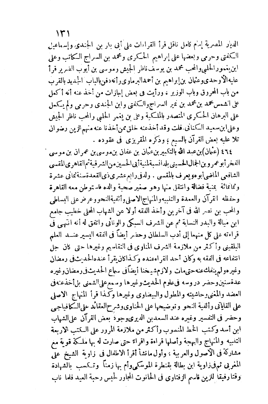 الديار المصرية إِمَام كَامِل ناقل قَرَأَ الْقرَاءَات على أبي بكر بن الجندي وَإِسْمَاعِيل الكفتي وحرمي وَبَعضهَا على إِبْرَاهِيم الحكري وَمُحَمّد بن السراج الْكَاتِب وعَلى ابْن يغمور الْحلَبِي والمحب مُحَمَّد بن يُوسُف نَاظر الْجَيْش ومُوسَى بن أَيُّوب الضَّرِير قَرَأَ عَلَيْهِ الأوحدي وَعُثْمَان بن إِبْرَاهِيم بن أَحْمد الْبرمَاوِيّ وَأَنه دفن بِالْبَابِ الْجَدِيد بِالْقربِ من بَاب المحروق وَبَاب الْوَزير، وَرَأَيْت فِي بعض إجازات من أَخذ عَنهُ أَنه أكمل على الشَّمْس مُحَمَّد بن مُحَمَّد بن نمير السراج والكفتي وَابْن الجندي وحرمي وَلم يكمل على الْبُرْهَان الحكري المتصدر بالملكية وَعلي بن يغمر الْحلَبِي والمحب نَاظر الْجَيْش وعَلى ابْن سعيد الْكِنَانِي. قلت: وَقد أَخذ عَنهُ خلق مِمَّن أَخذنَا عَنهُ مِنْهُم الزين رضوَان تَلا عَلَيْهِ بعض الْقُرْآن بالسبع وَذكره المقريزي فِي عقوده.)