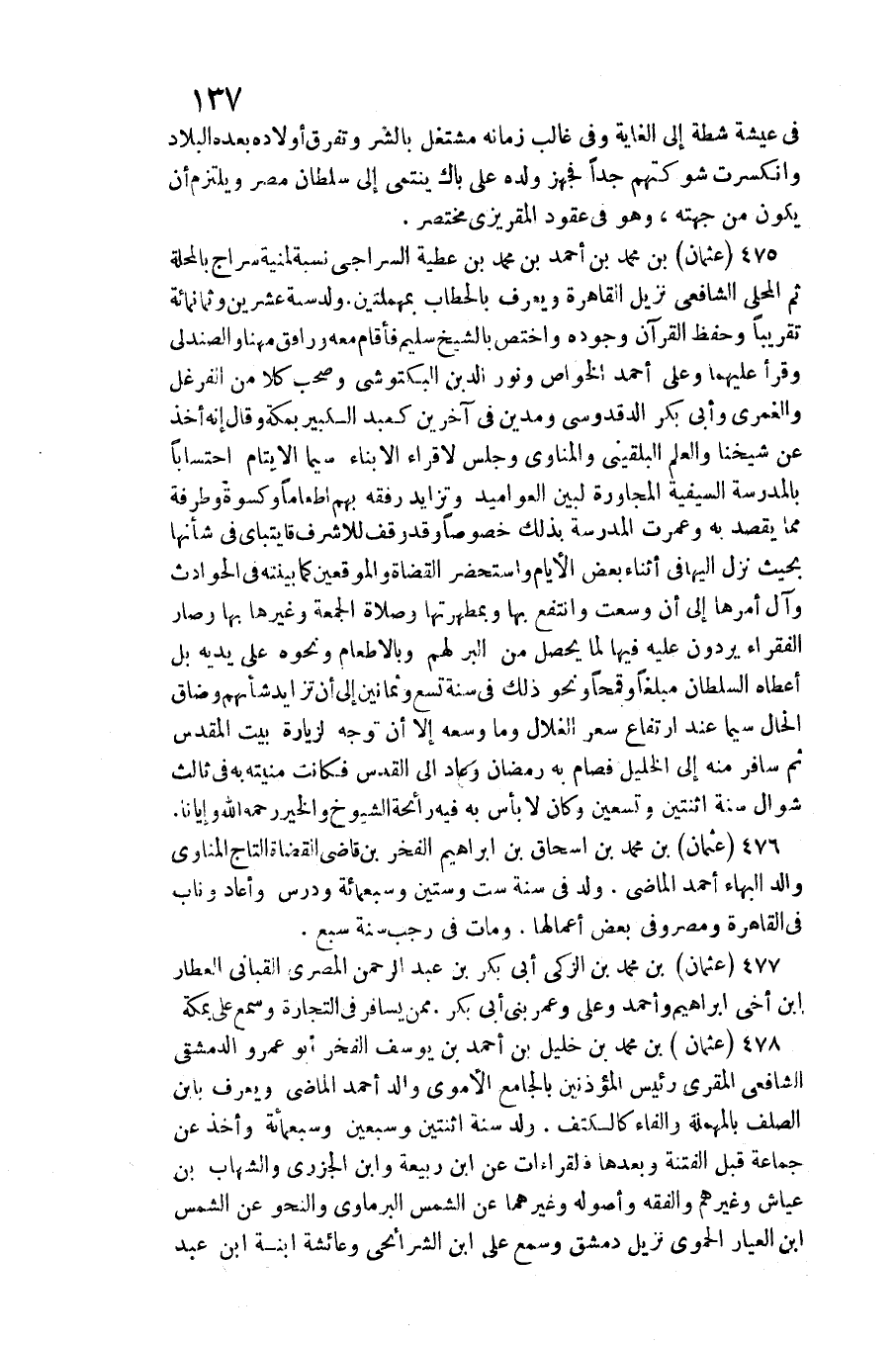 عُثْمَان بن مُحَمَّد بن أَحْمد بن مُحَمَّد بن عَطِيَّة السراجي نِسْبَة لمنية سراج بالمحلة ثمَّ الْمحلي الشَّافِعِي نزيل الْقَاهِرَة وَيعرف بالحطاب بمهملتين. ولد سنة عشْرين وَثَمَانمِائَة وَحفظ الْقُرْآن وجوده واختص بالشيخ سليم فَأَقَامَ مَعَه ورافق مهنا والصندلي وَقَرَأَ عَلَيْهِمَا وعَلى أَحْمد الْخَواص وَنور الدّين البكتوشي وَصَحب كلا من الفرغل والغمري وَأبي بكر الدقدوسي ومدين فِي آخَرين كَعبد الْكَبِير بِمَكَّة وَقَالَ أَنه أَخذ عَن شَيخنَا وَالْعلم البُلْقِينِيّ والمناوي وَجلسَ لإقراء الْأَبْنَاء سِيمَا الْأَيْتَام احتسابا بِالْمَدْرَسَةِ السيفية الْمُجَاورَة لبين العواميد وتزايد رفقه بهم إطعاما وَكِسْوَة وطرفة مِمَّا يقْصد بِهِ وعمرت الْمدرسَة بذلك خُصُوصا وَقد وقف للأشرف قايتباي فِي شَأْنهَا بِحَيْثُ نزل إِلَيْهَا فِي أثْنَاء بعض الْأَيَّام واستحضر الْقُضَاة والموقعين كَمَا بَينته فِي الْحَوَادِث وَآل أمرهَا إِلَى أَن وسعت وانتفع بهَا وبمطهرتها وَصَلَاة الْجُمُعَة وَغَيرهَا بهَا وَصَارَ الْفُقَرَاء يردون عَلَيْهِ فِيهَا لما يحصل من الْبر لَهُم وبالإطعام وَنَحْوه على يَدَيْهِ بل أعطَاهُ السُّلْطَان مبلغا وقمحا وَنَحْو ذَلِك فِي سنة تسع وَثَمَانِينَ إِلَى أَن تزايد شَأْنهمْ وضاق الْحَال سِيمَا عِنْد ارْتِفَاع سعر الغلال وَمَا وَسعه إِلَّا أَن توجه لزيارة بَيت الْمُقَدّس ثمَّ سَافر مِنْهُ إِلَى الْخَلِيل فصَام بِهِ رَمَضَان وَعَاد إِلَى الْقُدس فَكَانَت منيته بِهِ فِي ثَالِث شَوَّال سنة اثْنَتَيْنِ وَتِسْعين وَكَانَ لَا بَأْس بِهِ فِيهِ رَائِحَة الشُّيُوخ وَالْخَيْر رَحمَه الله وإيانا.