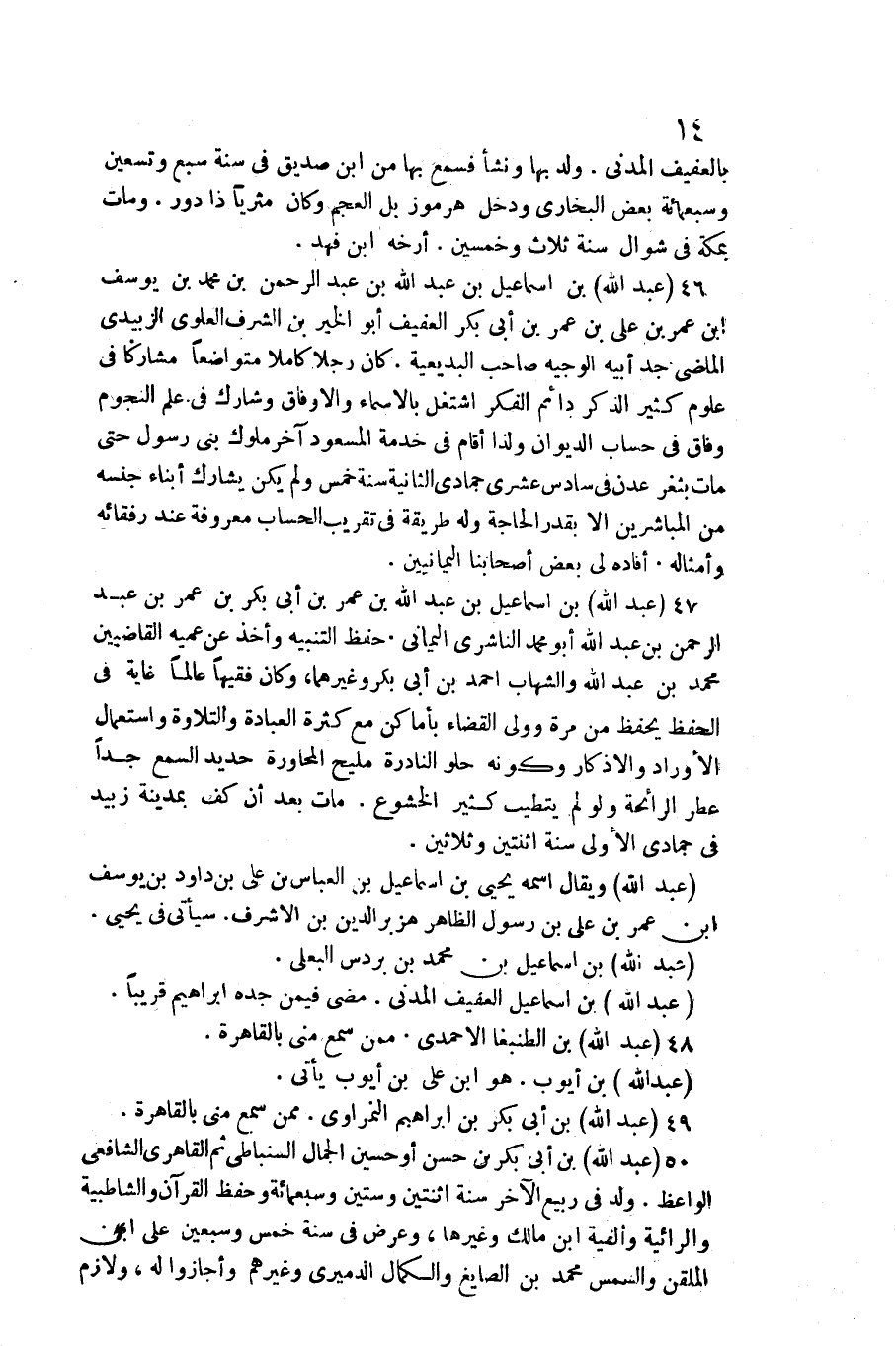 عبد الله بن إِسْمَاعِيل بن عبد الله بن عمر بن أبي بكر بن عمر بن عبد الرَّحْمَن بن عبد الله أَبُو مُحَمَّد النَّاشِرِيّ الْيَمَانِيّ. حفظ التَّنْبِيه وَأخذ عَن عميه القاضيين مُحَمَّد بن عبد الله والشهاب أَحْمد بن أبي بكر وَغَيرهمَا، وَكَانَ فَقِيها عَالما غَايَة فِي الْحِفْظ يحفظ من مرّة وَولي الْقَضَاء بأماكن مَعَ كَثْرَة الْعِبَادَة والتلاوة وَاسْتِعْمَال الأوراد والأذكار وَكَونه حُلْو النادرة مليح المحاورة حَدِيد السّمع جدا عطر الرَّائِحَة وَلَو لم يتطيب كثير الْخُشُوع. مَاتَ بعد أَن كف بِمَدِينَة زبيد فِي جُمَادَى الأولى سنة اثْنَتَيْنِ وَثَلَاثِينَ.)