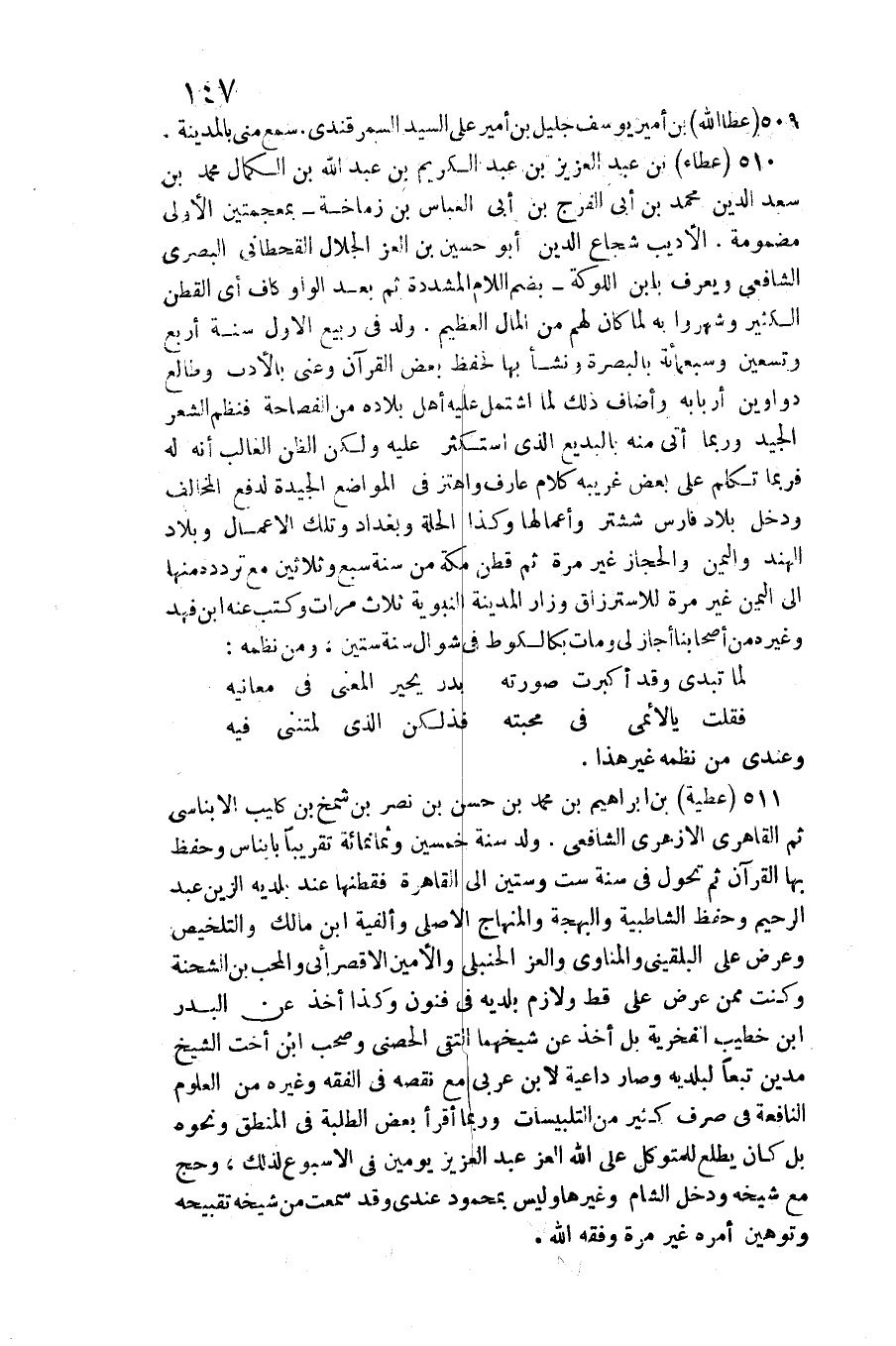 عَطاء بن عبد الْعَزِيز بن عبد الْكَرِيم بن عبد اله بن الْكَمَال مُحَمَّد بن سعد الدّين مُحَمَّد بن أبي الْفرج بن أبي الْعَبَّاس بن زماخة بمعجمتين الأولى مَضْمُومَة. الأديب شُجَاع الدّين أَبُو حُسَيْن بن الْعِزّ الْجلَال القحطاني الْبَصْرِيّ الشَّافِعِي وَيعرف بِابْن اللوكة بِضَم اللَّام الْمُشَدّدَة ثمَّ بعد الْوَاو كَاف أَي الْقطن الْكثير وشهروا بِهِ لما كَانَ لَهُم من المَال الْعَظِيم. ولد فِي ربيع الأول سنة أَربع وَتِسْعين وَسَبْعمائة بِالْبَصْرَةِ وَنَشَأ بهَا فحفظ الْقُرْآن وعني بالأدب وطالع دواوين أربابه)