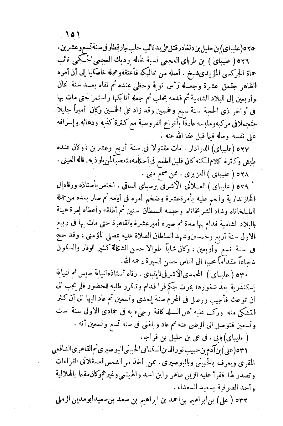 عليباي العلائي الأشرفي برسباي الساقي. اخْتصَّ بأستاذه ورقاه إِلَى الخازندارية وأنعم عَلَيْهِ بأمرة عشرَة وضخم أمره فِي أَيَّامه ثمَّ صَار بعده من جملَة الطبلخاناه وشاد الشربخاناه وحبسه السُّلْطَان سِنِين ثمَّ أطلقهُ وَأَعْطَاهُ إمرة هينة بالبلاد الشامية فدام بهَا مُدَّة ثمَّ صيره أَمِير عشرَة بِالْقَاهِرَةِ حَتَّى مَاتَ بهَا فِي ربيع الأول سنة أَربع وَخمسين وَشهد السُّلْطَان الصَّلَاة عَلَيْهِ بمصلى المؤمني، وَقد حج فِي سنة تسع وَأَرْبَعين، وَكَانَ شَابًّا طوَالًا حسن الشكالة كثير الْوَقار والسكون شجاعا مقداما محببا إِلَى النَّاس حسن السِّيرَة رَحمَه الله.