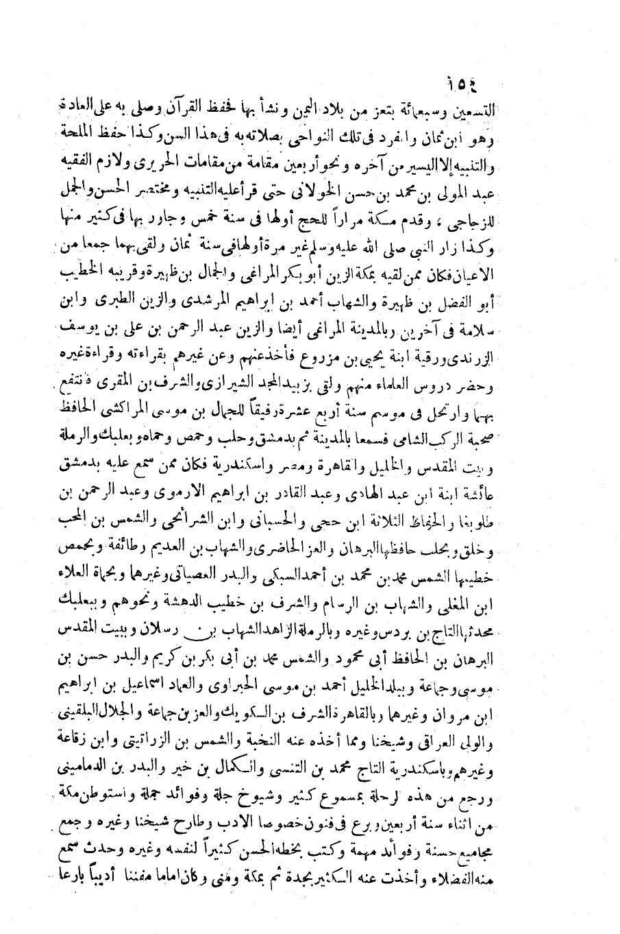الْبُرْهَان والعز الحاضري والشهاب بن العديم وَطَائِفَة وبحمص خطيبها الشَّمْس مُحَمَّد بن مُحَمَّد بن أَحْمد السُّبْكِيّ والبدر العصياتي وَغَيرهمَا وبحماة الْعَلَاء ابْن المغلي والشهاب بن الرسام والشرف بن خطيب الدهشة وَنَحْوهم وببعلبك محدثها التَّاج بن بردس وَغَيره وبالرملة الزَّاهِد الشهَاب بن رسْلَان وببيت الْمُقَدّس الْبُرْهَان بن الْحَافِظ أبي مَحْمُود وَالشَّمْس مُحَمَّد بن أبي بكر بن كريم والبدر حسن بن مُوسَى وَجَمَاعَة وببلد الْخَلِيل أَحْمد بن مُوسَى الحبراوي والعماد إِسْمَاعِيل بن إِبْرَاهِيم بن مَرْوَان وَغَيرهمَا وبالقاهرة الشّرف بن الكويك والعز بن جمَاعَة والجلال البُلْقِينِيّ وَالْوَلِيّ الْعِرَاقِيّ وَشَيخنَا وَمِمَّا أَخذه عَنهُ النخبة وَالشَّمْس بن الزراتيتي وَابْن زقاعة وَغَيرهم وبإسكندرية التَّاج مُحَمَّد بن التنسي والكمال بن خير والبدر بن الدماميني وَرجع من هَذِه لرحلة بمسموع كثير وشيوخ جلة وفوائد جملَة واستوطن مَكَّة من أثْنَاء سنة أَرْبَعِينَ وبرع فِي فنون خُصُوصا الْأَدَب وطارح شَيخنَا وَغَيره وَجمع مجاميع حَسَنَة وفوائد مهمة وَكتب بِخَطِّهِ الْحسن كثيرا لنَفسِهِ وَغَيره وَحدث سمع مِنْهُ الْفُضَلَاء وَأخذت عَنهُ الْكثير بجدة ثمَّ بِمَكَّة وَمنى وَكَانَ إِمَامًا مفننا أديبا بارعا