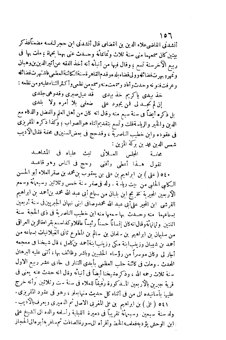 أَنْشدني القَاضِي عَلَاء الدّين بن القضامي قَالَ: أَنْشدني ابْن حجر لنَفسِهِ مضمنا فَذكر بَيْتَيْنِ كَانَ سمعهما مني سنة ثَلَاث وَثَمَانمِائَة وَحدث عني بهما بحماة مَاتَ بهَا فِي ربيع الآخر سنة تسع وَقَالَ فِيهَا من أنبائه أَنه أَخذ الْفِقْه عَن أثير الدّين بن وهبان وتمهر وبهرت فضائله وَولي قَضَاء بَلَده وَقدم الْقَاهِرَة سنة الكائنة الْعُظْمَى فاشتهرت فضائله وَعرفت فنونه وَحدث وَأفَاد وَسمعت مِنْهُ وَسمع من نظمي وَأكْثر الثَّنَاء عَلَيْهِ وَمن نظمه: