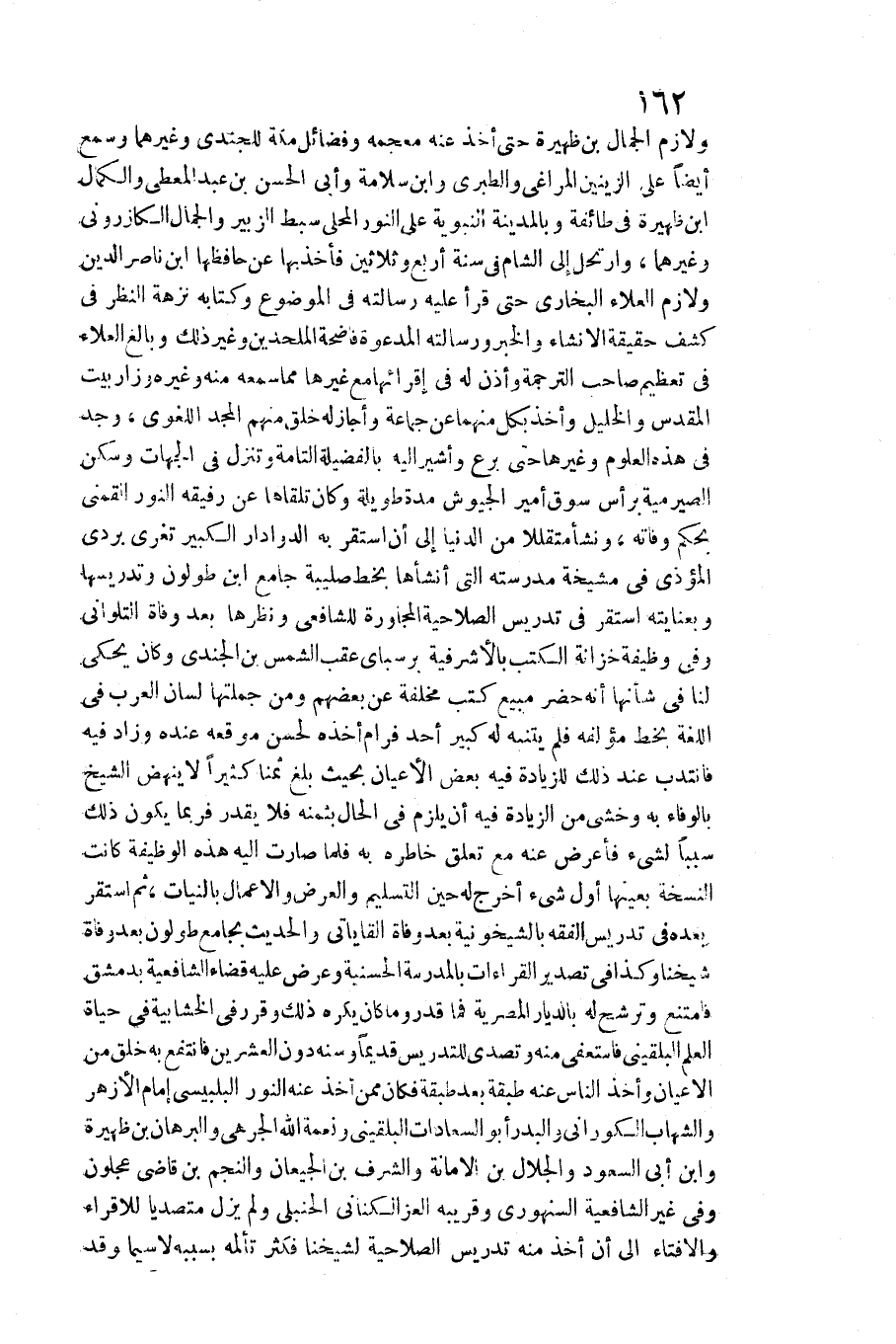 ولازم الْجمال بن ظهيرة حَتَّى أَخذ عَنهُ مُعْجَمه وفضائل مَكَّة للجندي وَغَيرهمَا وَسمع أَيْضا على الزينين المراغي والطبري وَابْن سَلامَة وَأبي الْحسن بن عبد الْمُعْطِي والكمال بن ظهيرة فِي طَائِفَة وبالمدينة النَّبَوِيَّة على النُّور الْمحلي سبط ازبير وَالْجمال الكازروني وَغَيرهمَا، وارتحل إِلَى الشَّام فِي سنة أَربع وَثَلَاثِينَ فَأخذ بهَا عَن حافظها ابْن نَاصِر الدّين ولازم الْعَلَاء البُخَارِيّ حَتَّى قَرَأَ عَلَيْهِ رسَالَته فِي الْمَوْضُوع وَكتابه نزهة النّظر فِي كشف حَقِيقَة الْإِنْشَاء وَالْخَبَر ورسالته المدعوة فاضحة الْمُلْحِدِينَ وَغير ذَلِك وَبَالغ الْعَلَاء فِي تَعْظِيم صَاحب التَّرْجَمَة وَأذن لَهُ فِي إقرائها مَعَ غَيرهَا مِمَّا سَمعه مِنْهُ وَغَيره وزار بَيت الْمُقَدّس والخليل وَأخذ بِكُل مِنْهُمَا عَن جمَاعَة وَأَجَازَ لَهُ خلق مِنْهُم الْمجد اللّغَوِيّ، وجد فِي هَذِه الْعُلُوم وَغَيرهَا حَتَّى برع وأشير إِلَيْهِ بالفضيلة التَّامَّة وتنزل فِي الْجِهَات وَسكن الصيرمية بِرَأْس سوق أَمِير الجيوش مُدَّة طَوِيلَة وَكَانَ تلقاها عَن رَفِيقه النُّور القمني بِحكم وَفَاته، وَنَشَأ متقللا من الدُّنْيَا إِلَى أَن اسْتَقر بِهِ الدوادار الْكَبِير تغرى بردى الْمُؤَدِّي فِي مشيخة مدرسته الَّتِي أَنْشَأَهَا بِخَط صليبة جَامع ابْن طولون وتدريسها وبعنايته اسْتَقر فِي تدريس الصلاحية الْمُجَاورَة للشَّافِعِيّ ونظرها بعد وَفَاة التلواني وَفِي وَظِيفَة خزانَة الْكتب بالأشرفية برسباعي عقب الشَّمْس بن الجندي وَكَانَ يَحْكِي لنا فِي شَأْنهَا أَنه حضر مَبِيع كتب مخلفة عَن بَعضهم وَمن جُمْلَتهَا لِسَان الْعَرَب فِي اللُّغَة بِخَط مُؤَلفه فَلم يتَنَبَّه لَهُ كَبِير أحد فرام أَخذه لحسن موقعه عِنْده وَزَاد فِيهِ فَانْتدبَ عِنْد ذَلِك للزِّيَادَة فِيهِ بعض الْأَعْيَان بِحَيْثُ بلغ ثمنا كثيرا لَا ينْهض الشَّيْخ بِالْوَفَاءِ بِهِ وخشي من الزِّيَادَة فِيهِ أَن يلْزم فِي الْحَال بِثمنِهِ فَلَا يقدر فَرُبمَا يكون ذَلِك سَببا لشَيْء فَأَعْرض عَنهُ مَعَ تعلق خاطره بِهِ فَلَمَّا صَارَت إِلَيْهِ هَذِه الْوَظِيفَة كَانَت النُّسْخَة بِعَينهَا أول شَيْء أخرج لَهُ حِين التَّسْلِيم وَالْعرض والأعمال بِالنِّيَّاتِ، ثمَّ اسْتَقر بعده فِي تدريس الْفِقْه بالشيخونية بعد وَفَاة القاياتي والْحَدِيث بِجَامِع طولون بعد وَفَاة شَيخنَا وَكَذَا فِي تصدير الْقرَاءَات بِالْمَدْرَسَةِ الحسنية وَعرض عَلَيْهِ قَضَاء الشَّافِعِيَّة بِدِمَشْق فَامْتنعَ وترشح لَهُ بالديار المصرية فَمَا قدر وَمَا كَانَ يكره ذَلِك وَقرر فِي الخشاية فِي حَيَاة الْعلم البُلْقِينِيّ فاستعفى مِنْهُ وتصدى للتدريس قَدِيما وسنه دون الْعشْرين فَانْتَفع بِهِ خلق من الْأَعْيَان وَأخذ النَّاس عَنهُ طبقَة بعد طبقَة فَكَانَ مِمَّن أَخذ عَنهُ النُّور البلبيسي إِمَام الْأَزْهَر والشهاب الكوراني والبدر أَبُو السعادات البُلْقِينِيّ ونعمة الله الجرهي والبرهان بن)