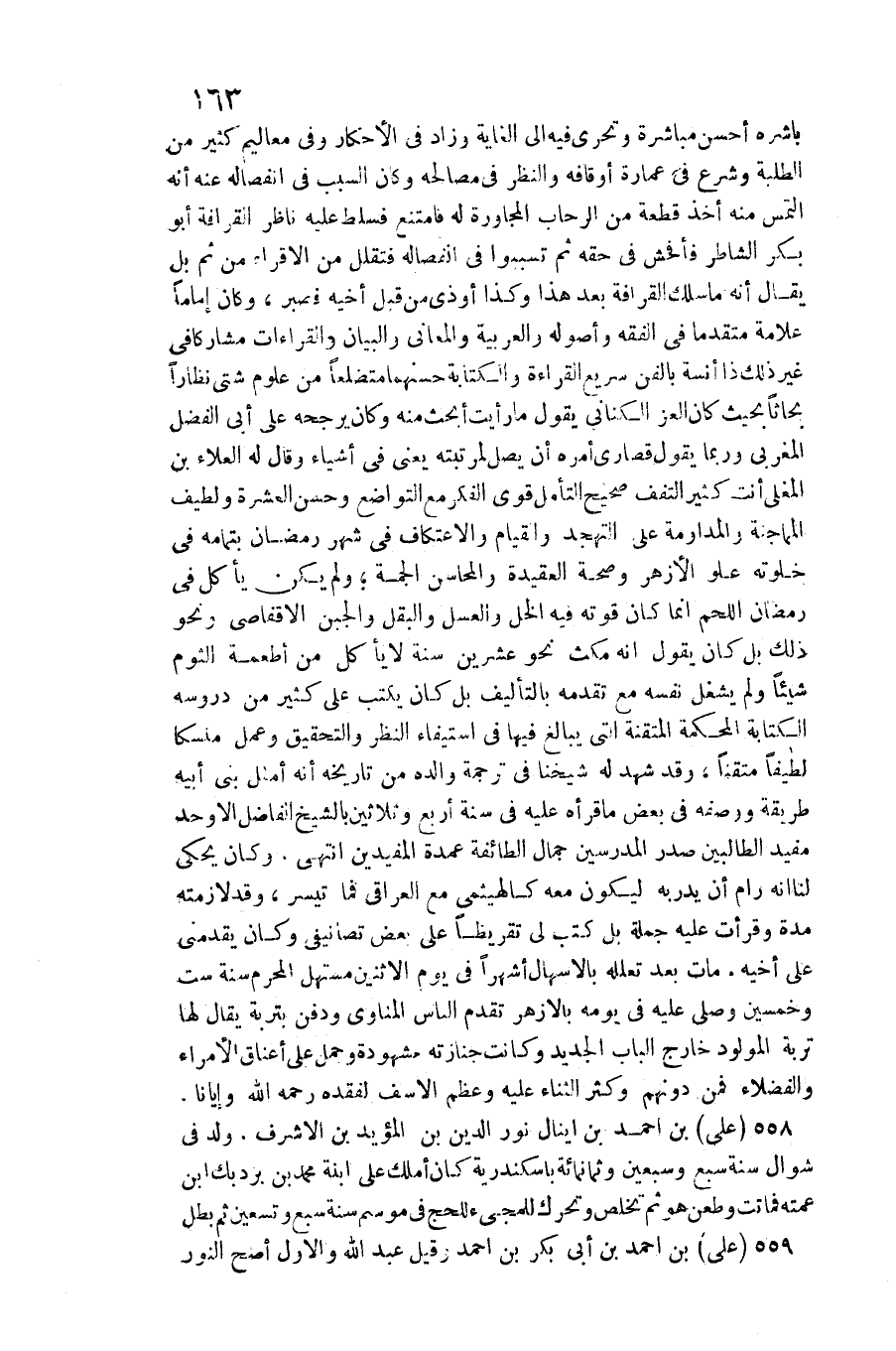 بَاشرهُ أحسن مُبَاشرَة وتحرى فِيهِ إِلَى الْغَايَة وَزَاد فِي الأحكار وَفِي معاليم كثير من الطّلبَة وَشرع فِي عمَارَة أوقافه وَالنَّظَر فِي مَصَالِحه وَكَانَ السَّبَب فِي انْفِصَاله عَنهُ أَنه التمس مِنْهُ قِطْعَة من الرحاب الْمُجَاورَة لَهُ فَامْتنعَ فَسلط عَلَيْهِ نَاظر القرافة أَبُو بكر الشاطر فأفحش فِي حَقه ثمَّ تسببوا فِي انْفِصَاله فتقلل من الإقراء من ثمَّ بل يُقَال أَنه مَا سلك القرافة بعد هَذَا وَكَذَا أوذي من قبل أَخِيه فَصَبر، وَكَانَ إِمَامًا عَلامَة مُتَقَدما فِي الْفِقْه وأصوله والعربية والمعاني وَالْبَيَان والقراءات مشاركا فِي غير ذَلِك ذَا أنسة بالفن سريع الْقِرَاءَة وَالْكِتَابَة حسنهما متضلعا من عُلُوم شَتَّى نظارا بحاثا بِحَيْثُ كَانَ الْعِزّ الْكِنَانِي يَقُول مَا رَأَيْت أبحث مِنْهُ وَكَانَ يرجحه على أبي الْفضل المغربي وَرُبمَا يَقُول قصارى أمره أَن يصل لمرتبته يَعْنِي فِي أَشْيَاء وَقَالَ لَهُ الْعَلَاء بن المغلي أَنْت كثير التفف صَحِيح التَّأَمُّل قوي الْفِكر مَعَ التَّوَاضُع وَحسن الْعشْرَة ولطيف المماجنة والمداومة على التَّهَجُّد وَالْقِيَام وَالِاعْتِكَاف فِي شهر رَمَضَان بِتَمَامِهِ فِي خلوته علو الْأَزْهَر وَصِحَّة العقيدة والمحاسن الجمة وَلم يكن يَأْكُل فِي رَمَضَان اللَّحْم إِنَّمَا كَانَ قوته فِيهِ الْخلّ وَالْعَسَل والبقل والجبن الأقفاصي وَنَحْو ذَلِك بل كَانَ يَقُول أَنه مكث نَحْو عشْرين سنة لَا يَأْكُل من أَطْعِمَة الثوم شَيْئا وَلم يشغل نَفسه مَعَ تقدمه بالتأليف بل كَانَ يكْتب على كثير من دروسه الْكِتَابَة المحكمة المتقنة الَّتِي يُبَالغ فِيهَا فِي اسْتِيفَاء النّظر وَالتَّحْقِيق وَعمل منسكا لطيفا متقنا، وَقد شهد لَهُ شَيخنَا فِي تَرْجَمَة وَالِده من تَارِيخه أَنه أمثل بني أَبِيه طَريقَة وَوَصفه فِي بعض مَا قَرَأَهُ عَلَيْهِ فِي سنة أَربع وَثَلَاثِينَ بالشيخ الْفَاضِل الأوحد مُفِيد الطالبين صدر المدرسين جمال الطَّائِفَة عُمْدَة المفيدين انْتهى. وَكَانَ يَحْكِي لنا أَنه رام أَن يدربه ليَكُون مَعَه كالهيثم مَعَ الْعِرَاقِيّ فَمَا تيَسّر، وَقد لازمته مُدَّة وقرأت عَلَيْهِ جملَة بل كتب لي تقريظا على بعض تصانيفي وَكَانَ يقدمني على أَخِيه. مَاتَ بعد تعلله بالإسهال أشهرا فِي يَوْم الِاثْنَيْنِ مستهل الْمحرم سنة سِتّ وَخمسين وَصلى عَلَيْهِ فِي يَوْمه بالأزهر تقدم النَّاس الْمَنَاوِيّ وَدفن بتربة يُقَال لَهَا تربة الْمَوْلُود خَارج الْبَاب الْجَدِيد وَكَانَت جنَازَته مَشْهُودَة وَحمل على أَعْنَاق الْأُمَرَاء والفضلاء فَمن دونهم وَكثر الثَّنَاء عَلَيْهِ وَعظم الأسف لفقده رَحمَه الله وإيانا.)