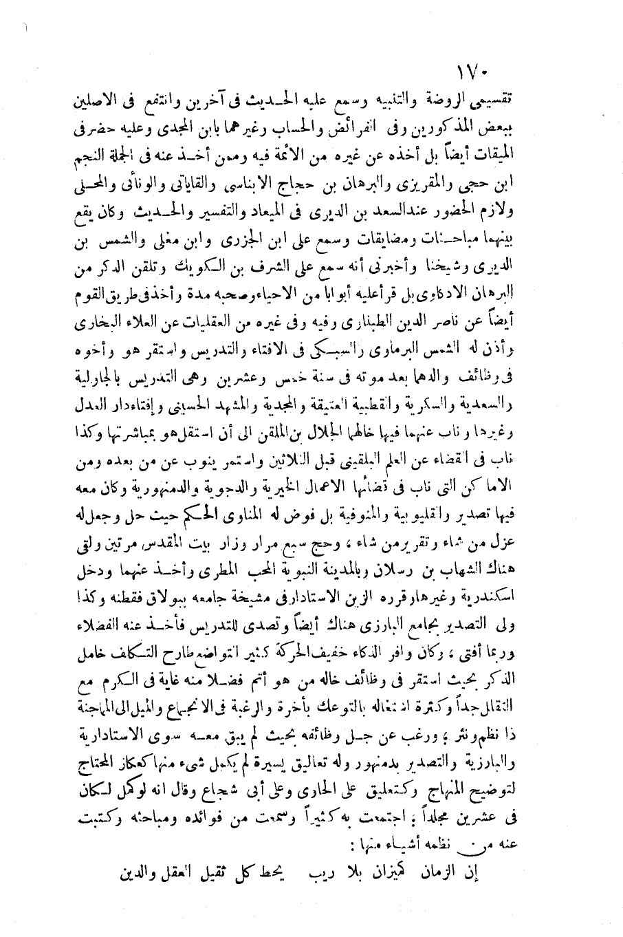 تقسيمي الرَّوْضَة والتنبيه وَسمع عَلَيْهِ الحَدِيث فِي آخَرين وانتفع فِي الْأَصْلَيْنِ بِبَعْض الْمَذْكُورين وَفِي الْفَرَائِض والحساب وَغَيرهمَا بِابْن المجدي وَعَلِيهِ حضر فِي الْمِيقَات أَيْضا بل أَخذه عَن غَيره من الْأَئِمَّة فِيهِ وَمِمَّنْ أَخذ عَنهُ فِي الْجُمْلَة النَّجْم ابْن حجي والمقريزي والبرهان بن حجاج الأبناسي والقاياتي والونائي والمحلي ولازم الْحُضُور عِنْد السعد بن الديري فِي الميعاد وَالتَّفْسِير والْحَدِيث وَكَانَ يَقع بَينهمَا مباحثات ومضايقات وَسمع على ابْن الْجَزرِي وَابْن مغلي وَالشَّمْس بن الديري وَشَيخنَا وَأَخْبرنِي أَنه سمع على الشّرف بن الكويك وتلقن الذّكر من الْبُرْهَان الأدكاوي بل قَرَأَ عَلَيْهِ أبوابا من الْأَحْيَاء وَصَحبه مُدَّة وَأخذ فِي طَرِيق لقوم أَيْضا عَن نَاصِر الدّين الطبناوي وَفِيه وَفِي غَيره من)