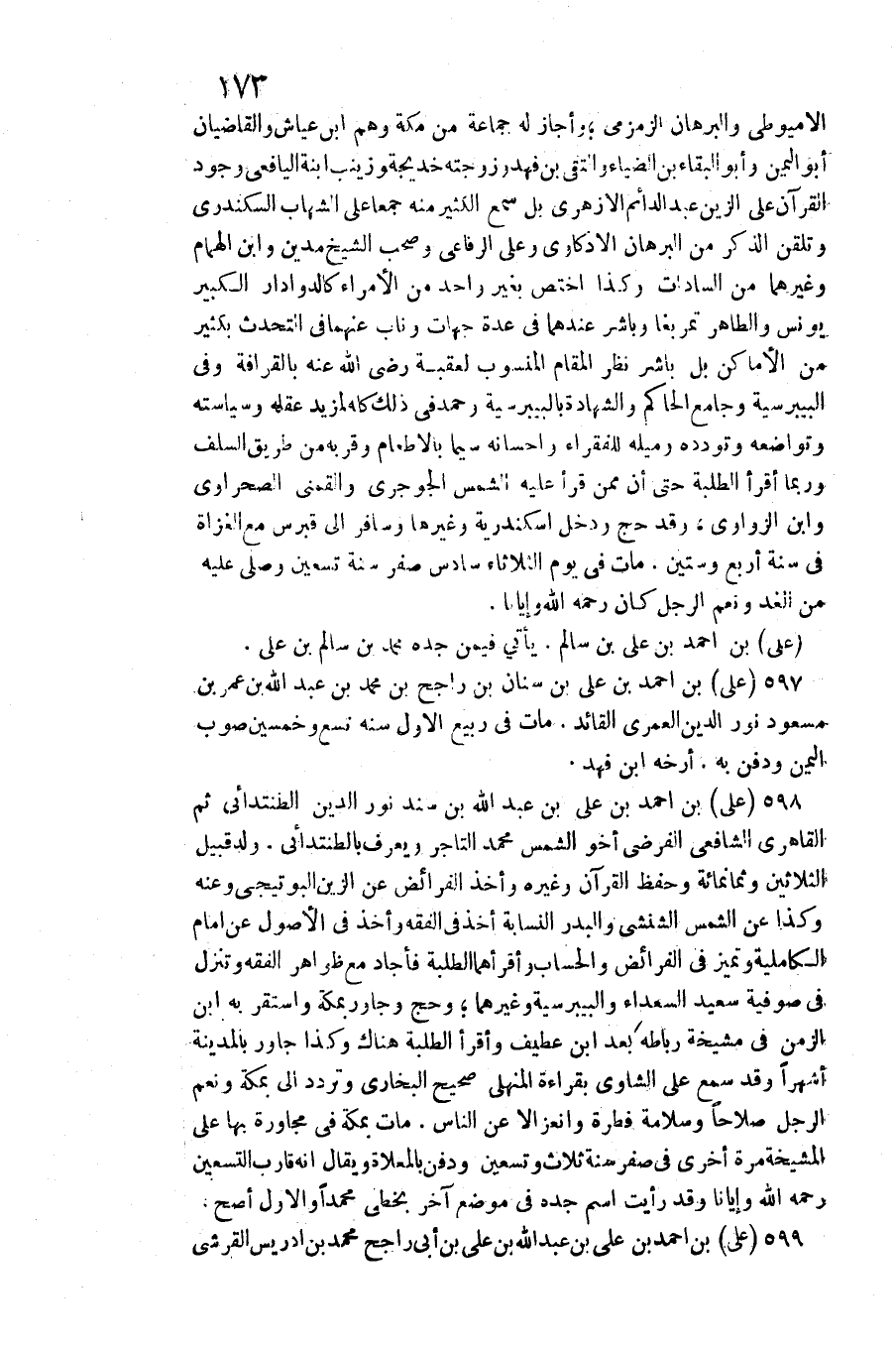 عَليّ بن أَحْمد بن عَليّ بن سِنَان بن رَاجِح بن مُحَمَّد بن عبد الله بن عمر بن مَسْعُود نور الدّين الْعمريّ الْقَائِد. مَاتَ فِي ربيع الأول سنة تسع وَخمسين صوب الْيمن وَدفن بِهِ. أرخه ابْن فَهد.