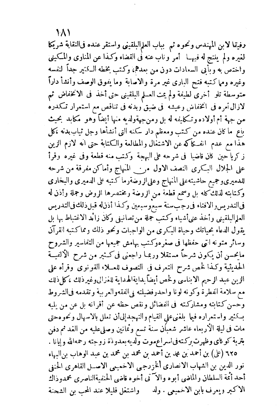 رَفِيقًا لِابْنِ المهندس وَنَحْوه ثمَّ بِبَاب الْعلم البُلْقِينِيّ وَاسْتقر عِنْده فِي النقابة شَرِيكا لغيره وَلم ينْتج لَهُ فِيهَا أَمر وناب عَنهُ فِي الْقَضَاء وَكَذَا عَن الْمَنَاوِيّ والمكيني واختص بِهِ وبأبي السعادات دون من بعدهمْ، وَكتب بِخَطِّهِ الْكثير جدا لنَفسِهِ وَغَيره وَمِمَّا كتبه فتح الْبَارِي غير مرّة والإصابة وَمَا يفوق الْوَصْف وَأَنْشَأَ دَارا متوسطة تلو أُخْرَى لَطِيفَة وَلم يمت الْعلم البُلْقِينِيّ حَتَّى أَخذ فِي الانخفاض ثمَّ لَا زَالَ أمره فِي انخفاض وعيشه فِي ضيق وبدنه فِي تناقص مَعَ اسْتِمْرَار تكدره من جِهَة أم أَوْلَاده وتكليفه لَهُ بل وَمن جِهَة ولديه مِنْهَا أَيْضا وَهُوَ مكابد بِحَيْثُ بَاعَ مَا كَانَ عِنْده من كتب ومعظم دَار سكنه الَّتِي أَنْشَأَهَا وَجل ثِيَاب بدنه، كل هَذَا مَعَ عدم انفكاكه عَن الِاشْتِغَال والمطالعة وَالْكِتَابَة حَتَّى أَنه لَازم الزين زَكَرِيَّا حِين كَانَ قَاضِيا فِي شَرحه على الْبَهْجَة وَكتب مِنْهُ قِطْعَة وَفِي غَيره وَقَرَأَ على الْجلَال الْبكْرِيّ النّصْف الأول من الْمِنْهَاج وأماكن مفرقة من شَرحه للدميري وَجَمِيع حَاشِيَته على الْمِنْهَاج وعَلى الرَّوْضَة وَمَا كتبه على الدَّمِيرِيّ وَالْبُخَارِيّ وكتابته لذَلِك كُله بل وَسمع قِطْعَة من الرَّوْضَة ومختصرها الرَّوْض وَجُمْلَة وَأذن لَهُ فِي التدريس والإفتاء فِي رَجَب سنة سبع وَسبعين وَكَذَا أذن لَهُ قبل ذَلِك فِي التدريس الْعلم البُلْقِينِيّ وَأخذ عني أَشْيَاء وَكتب)