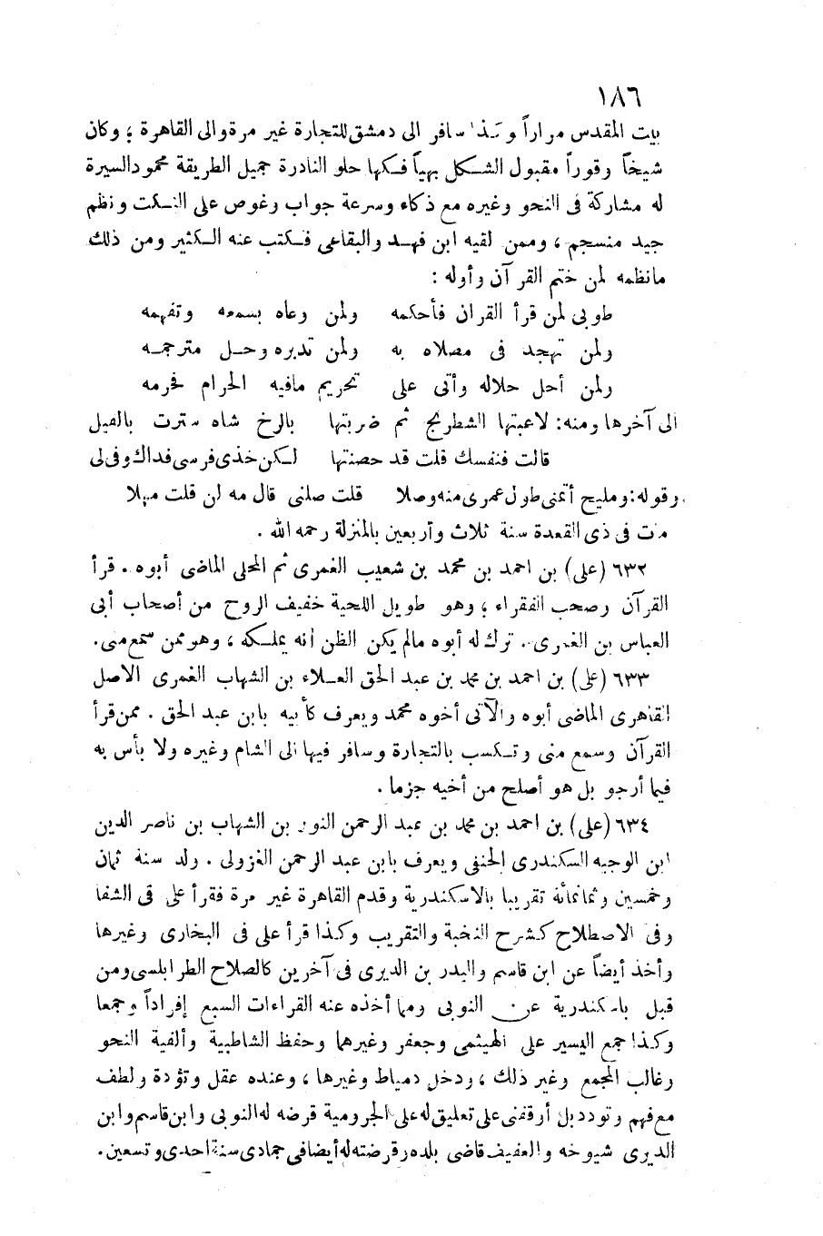 بَيت الْمُقَدّس مرَارًا وَكَذَا سَافر إِلَى دمشق للتِّجَارَة غير مرّة وَإِلَى الْقَاهِرَة وَكَانَ شَيخا وقورا مَقْبُول الشكل بهيا فكها حُلْو النادرة جميل الطَّرِيقَة مَحْمُود السِّيرَة لَهُ مُشَاركَة فِي النَّحْو وَغَيره مَعَ ذكاء وَسُرْعَة جَوَاب وغوص على النكت ونظم جيد منسجم، وَمِمَّنْ لقِيه ابْن فَهد والبقاعي فَكتب عَنهُ الْكثير وَمن ذَلِك مَا نظمه لمن ختم الْقُرْآن وأوله: