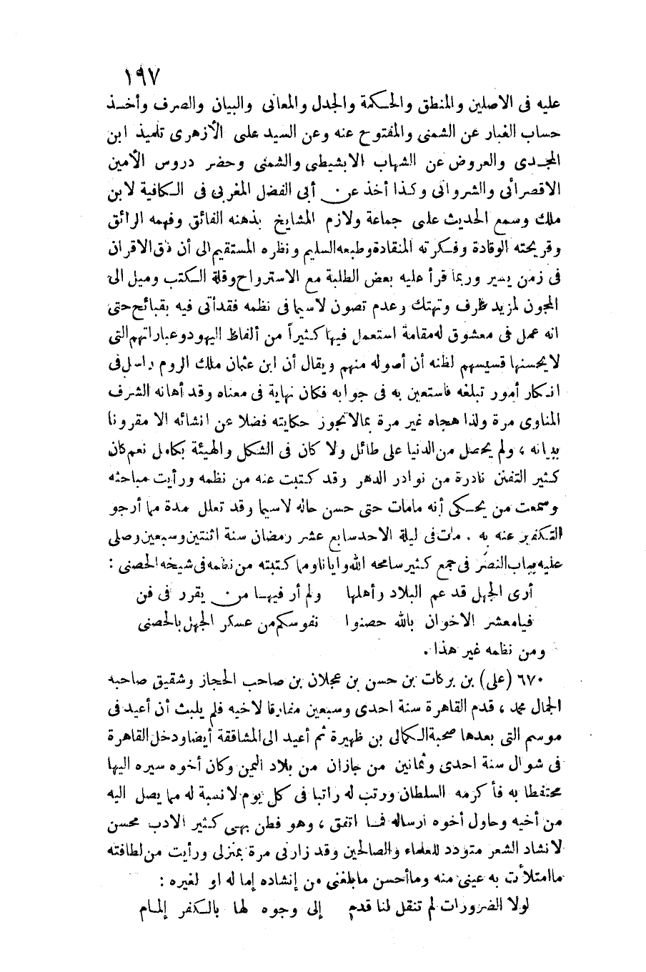 عَلَيْهِ فِي الْأَصْلَيْنِ والمنطق وَالْحكمَة والجدل والمعاني وَالْبَيَان وَالصرْف وَأخذ حِسَاب الْغُبَار عَن الشمني والمفتوح عَنهُ وَعَن السَّيِّد عَليّ الْأَزْهَرِي تلميذ ابْن المجدي وَالْعرُوض عَن الشهَاب الأبشيطي والشمني وَحضر دروس الْأمين الأقصرائي والشرواني وَكَذَا أَخذ عَن أبي الْفضل المغربي فِي الكافية لِابْنِ ملك وَسمع الحَدِيث على جمَاعَة ولازم الْمَشَايِخ بذهنه الْفَائِق وفهمه الرَّائِق وقريحته الوقادة وفكرته المنقادة وطبعه السَّلِيم وَنَظره الْمُسْتَقيم إِلَى أَن فاق الأقران فِي زمن يسير وَرُبمَا قَرَأَ عَلَيْهِ بعض الطّلبَة مَعَ الاسترواح وَقلة الْكتب وميل إِلَى المجون لمزيد ظرف وتهتك وَعدم تصون لَا سِيمَا فِي نظمه فقداني فِيهِ بقبائح حَتَّى أَنه عمل فِي معشوق لَهُ مقامة اسْتعْمل فِيهَا كثيرا من أَلْفَاظ الْيَهُود)