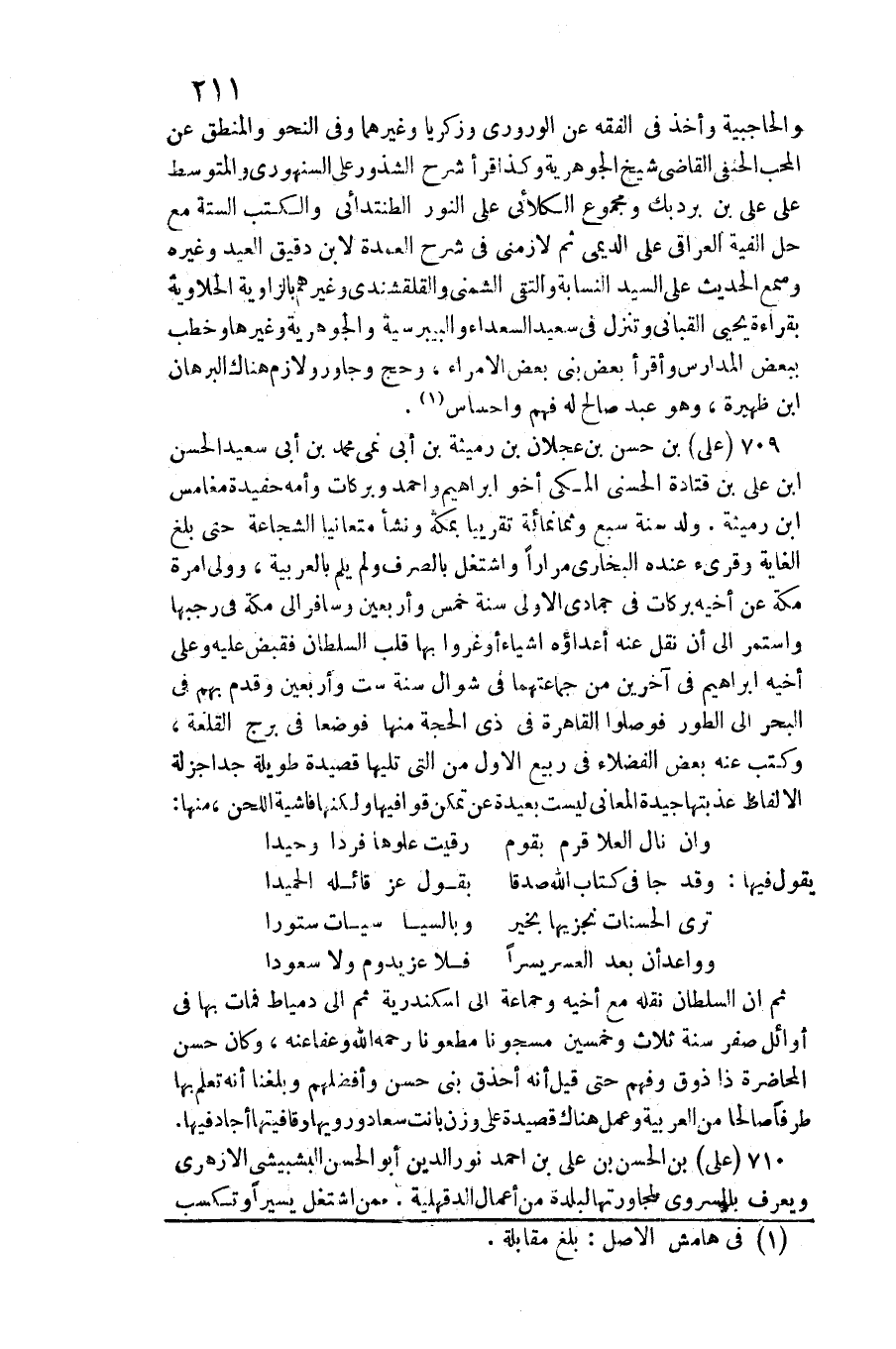 والحاجبية وَأخذ فِي الْفِقْه عَن الوروري وزَكَرِيا وَغَيرهمَا وَفِي النَّحْو والمنطق عَن الْمُحب الْحَنَفِيّ القَاضِي شيخ الجوهرية وَكَذَا قَرَأَ لأبي عَمْرو إِلَى آخر النَّحْل، والمنهاج وألفية النَّحْو والجرومية والحاجبية وَأخذ فِي الْفِقْه عَن الوروري وزَكَرِيا وَغَيرهمَا وَفِي النَّحْو والمنطق عَن الْمُحب الْحَنَفِيّ القَاضِي شيخ الجوهرية وَكَذَا قَرَأَ شرح الشذور على السنهوري والمتوسط على عَليّ بن برد بك ومجموع الكلائي على النُّور الطنتدائي والكتب السِّتَّة مَعَ حل ألفية الْعِرَاقِيّ على الديمي ثمَّ لازمني فِي شرح الْعُمْدَة لِابْنِ دَقِيق الْعِيد وَغَيره وَسمع الحَدِيث على السَّيِّد النسابة والتقي الشمني والقلقشندي وَغَيرهم بالزاوية الحلاوية بِقِرَاءَة يحيى القباني وتنزل فِي سعيد السُّعَدَاء والبيبرسية والجوهرية وَغَيرهَا وخطب بِبَعْض الْمدَارِس وأقرأ بعض بني بعض الْأُمَرَاء، وَحج وجاور ولازم هُنَاكَ الْبُرْهَان بن ظهيرة، وَهُوَ عبد صَالح لَهُ فهم وإحساس.