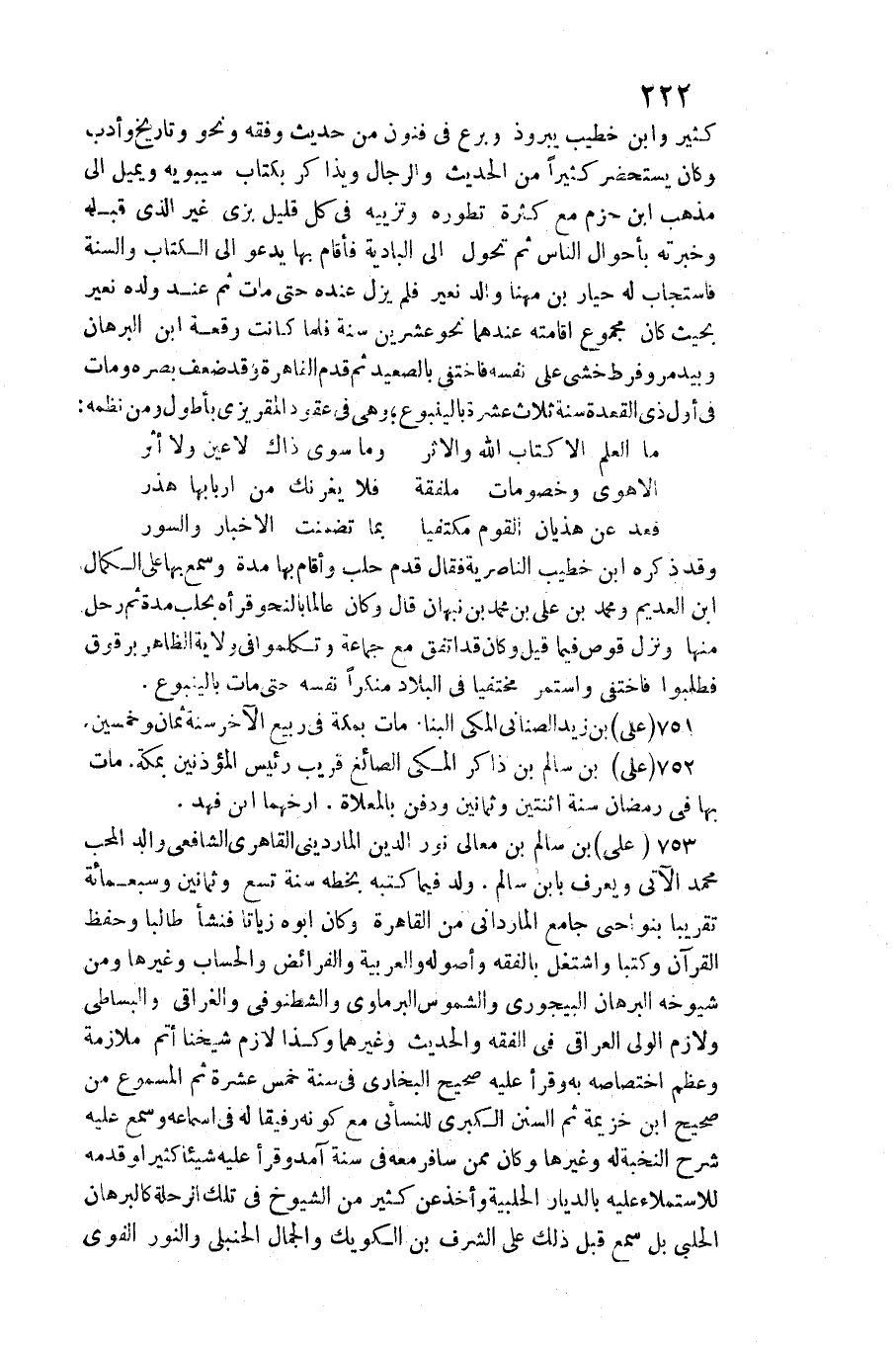 كثير وَابْن خطيب يبروذ وبرع فِي فنون من حَدِيث وَفقه وَنَحْو وتاريخ وأدب وَكَانَ يستحضر كثيرا من الحَدِيث وَالرِّجَال ويذاكر بِكِتَاب سِيبَوَيْهٍ ويميل إِلَى مَذْهَب ابْن حزم مَعَ كَثْرَة تطوره وتزييه فِي كل قَلِيل بزِي غير الَّذِي قبله وخبرته بأحوال النَّاس ثمَّ تحول إِلَى الْبَادِيَة فَأَقَامَ بهَا يَدْعُو إِلَى الْكتاب وَالسّنة فَاسْتَجَاب لَهُ حيار بن مهنا وَالِد نعير فَلم يزل عِنْده حَتَّى مَاتَ ثمَّ عِنْد وَلَده نعير بِحَيْثُ كَانَ مَجْمُوع إِقَامَته عِنْدهمَا نَحْو عشْرين سنة فَلَمَّا كَانَت رقْعَة ابْن الْبُرْهَان وبيدمر وفرط خشِي على نَفسه فاختفى بالصعيد ثمَّ قدم الْقَاهِرَة وَقد ضعف بَصَره وَمَات فِي أول ذِي الْقعدَة سنة ثَلَاث عشرَة بالينبوع وَهِي فِي عُقُود المقريزي بأطول وَمن نظمه: